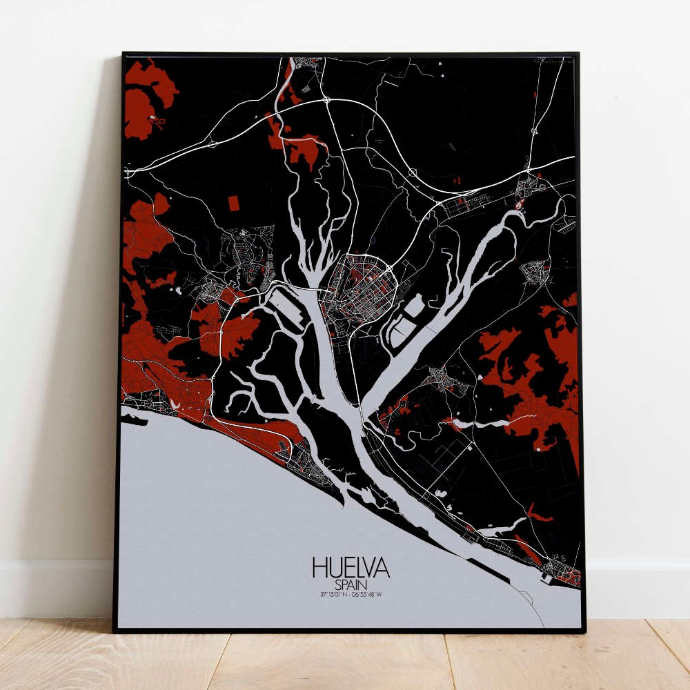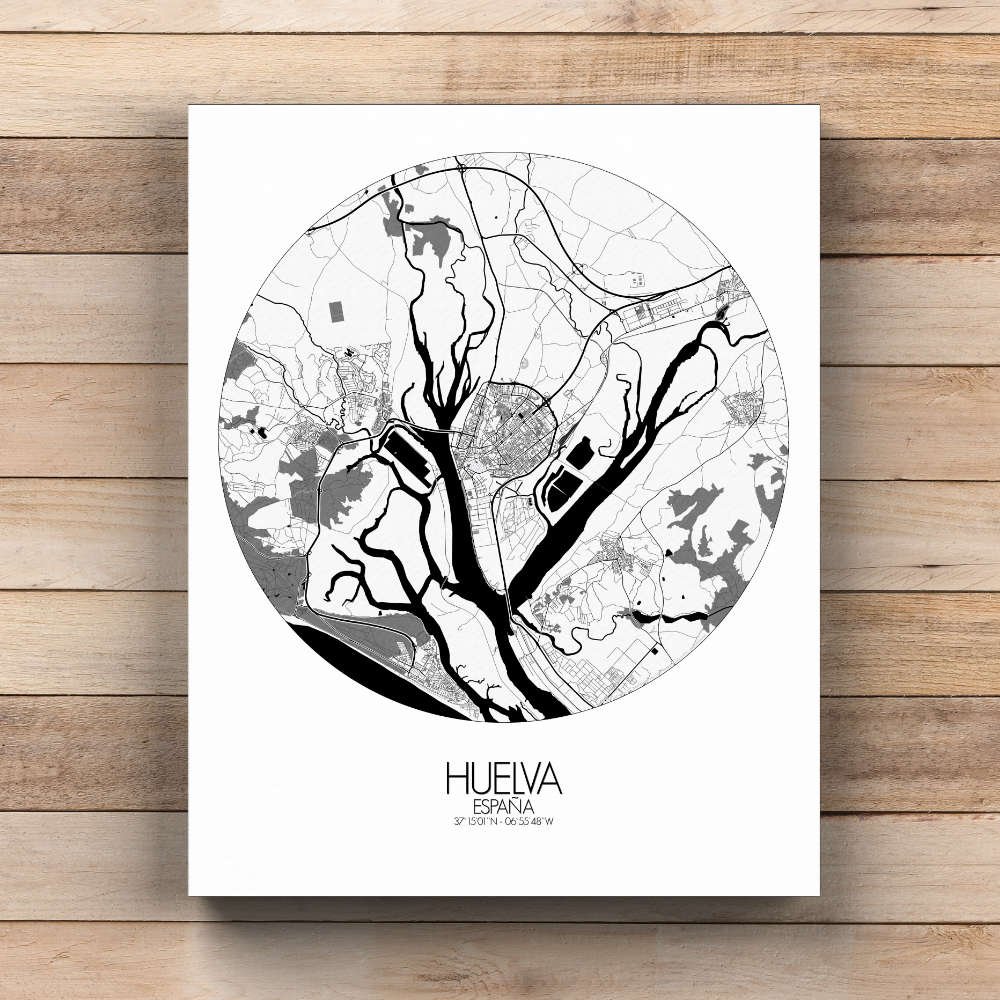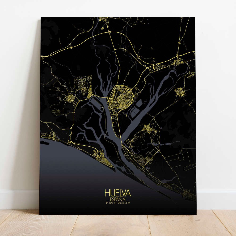 Poster City map de Huelva, España: no es tan solo una celebración visual del paisaje único y del rico patrimonio de la ciudad — es un tema de conversación, un recuerdo y una fuente de inspiración, todo reunido en un delicioso conjunto.
