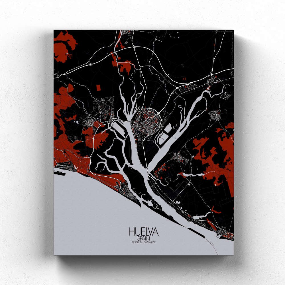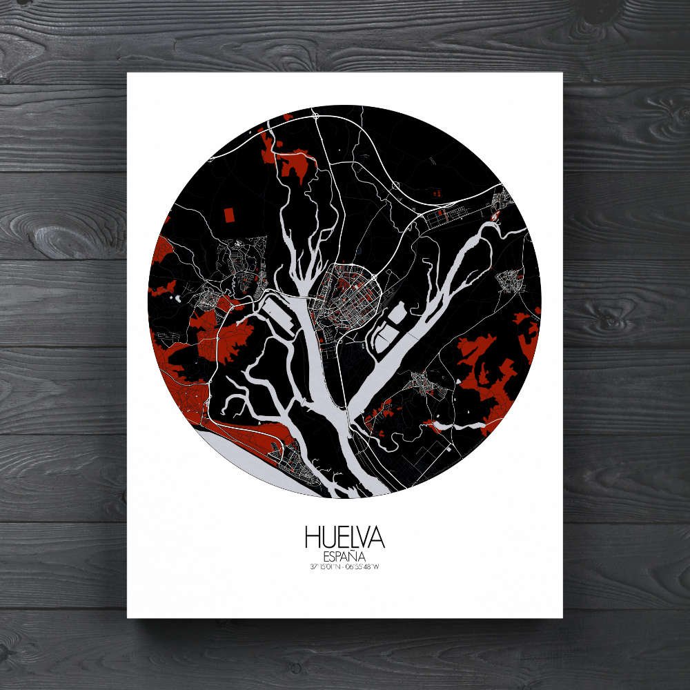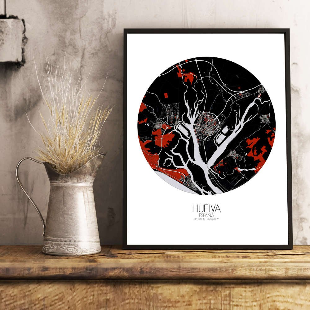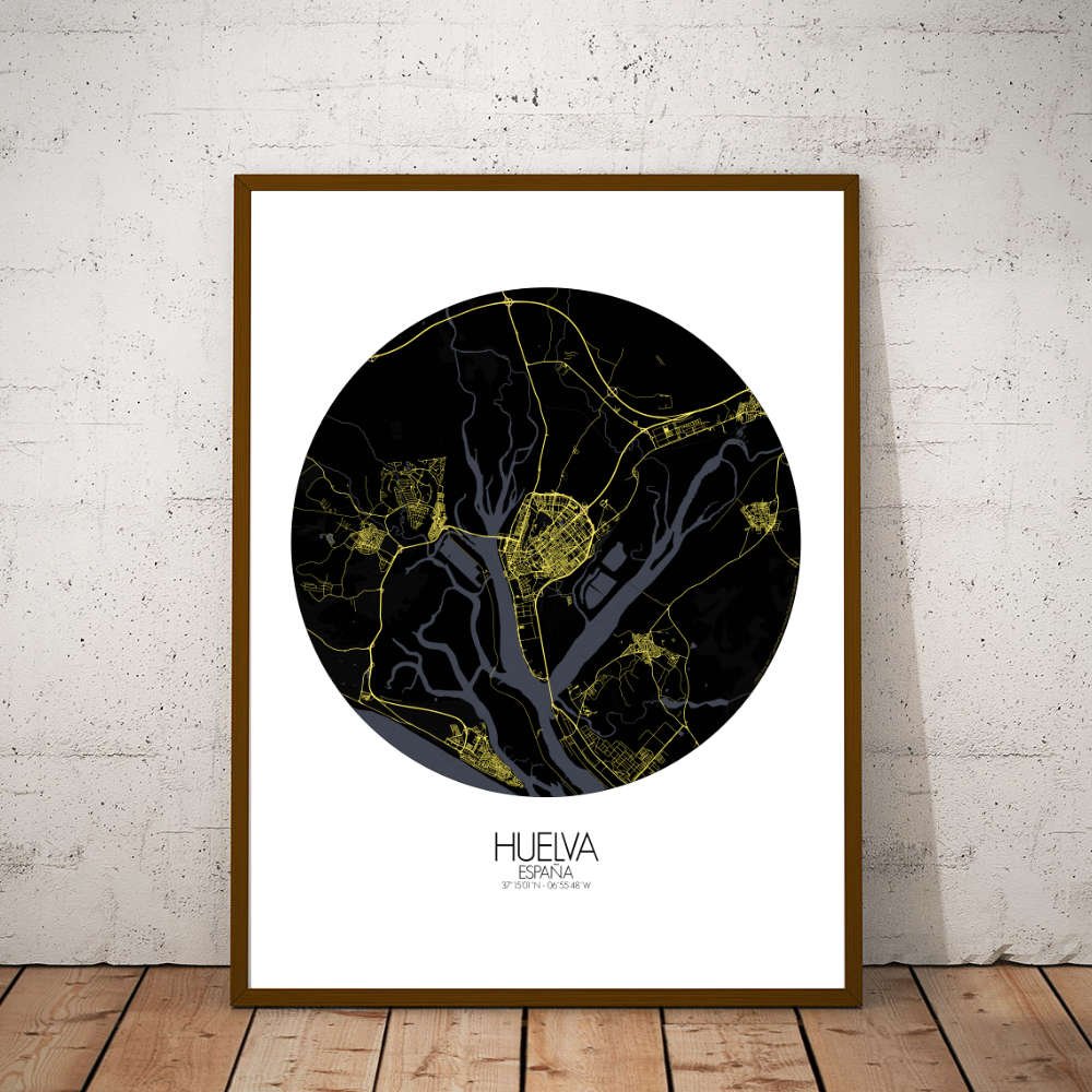 Poster City map de Huelva, España: no es tan solo una celebración visual del paisaje único y del rico patrimonio de la ciudad — es un tema de conversación, un recuerdo y una fuente de inspiración, todo reunido en un delicioso conjunto.