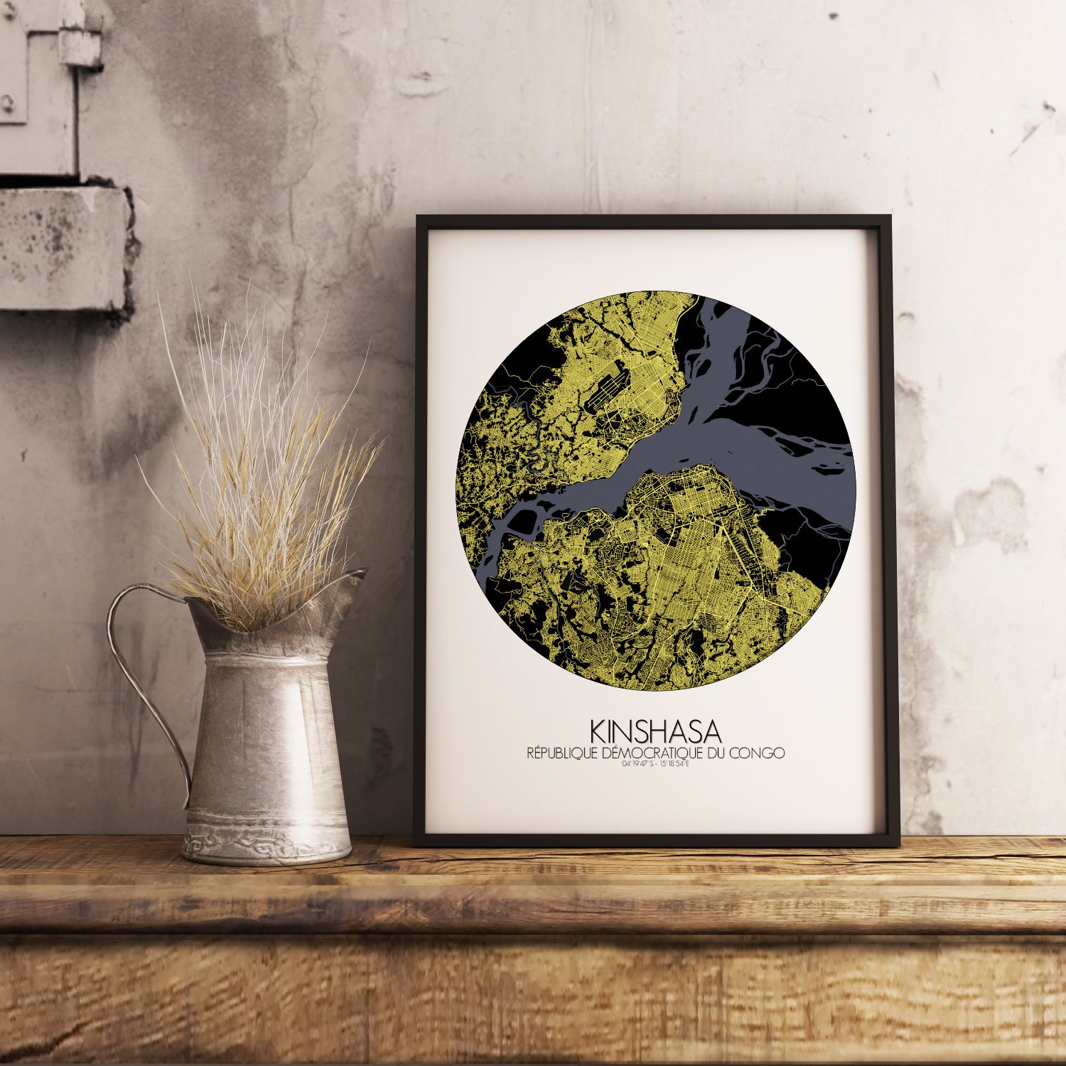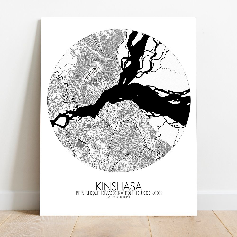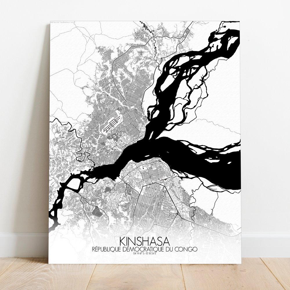 Poster City map de Kinshasa, R.D. del Congo: Cuelga este mapa en tu pared y estarás colgando un trozo de geografía viva: una ciudad dibujada no solo por planificadores y ríos, sino por la memoria de reinos, el ritmo del soukous y el ojo siempre curioso del viajero.
