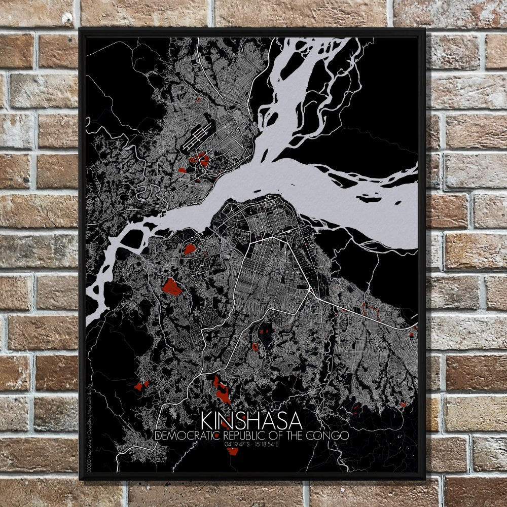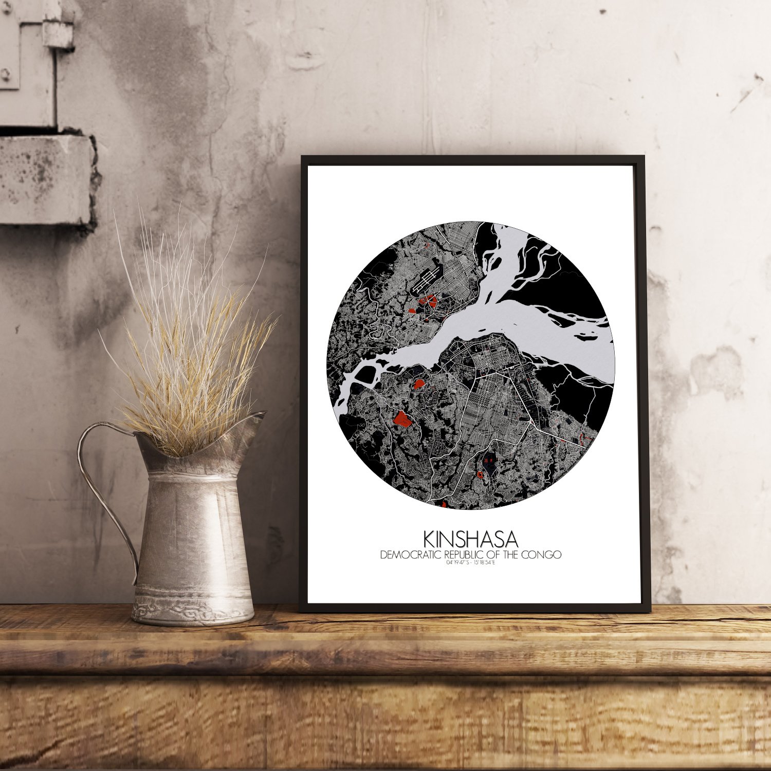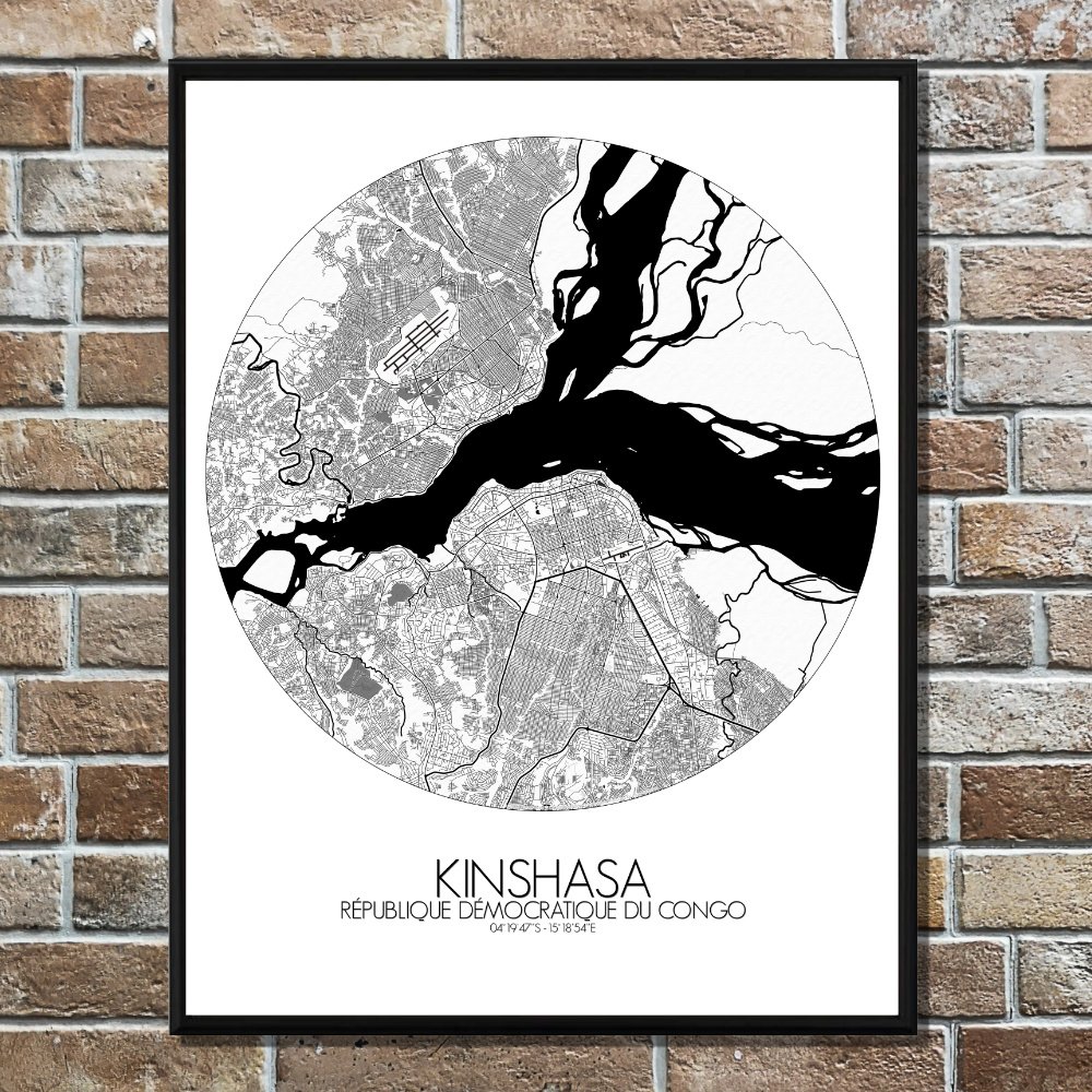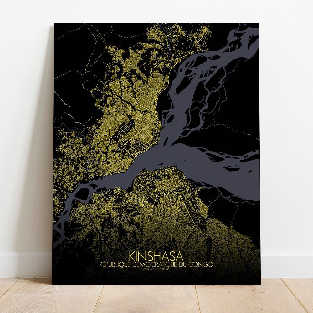 Poster City map de Kinshasa, R.D. del Congo: Cuelga este mapa en tu pared y estarás colgando un trozo de geografía viva: una ciudad dibujada no solo por planificadores y ríos, sino por la memoria de reinos, el ritmo del soukous y el ojo siempre curioso del viajero.