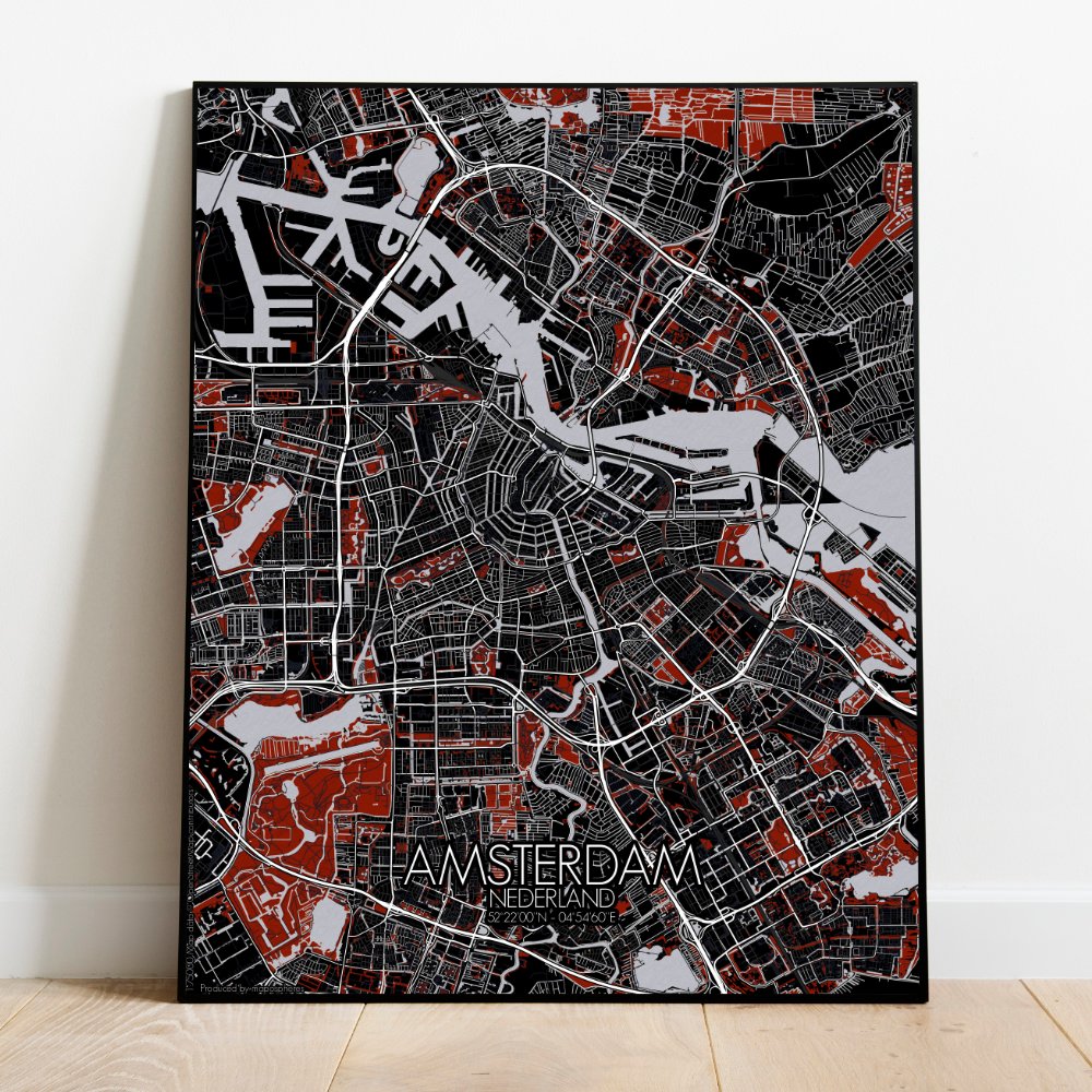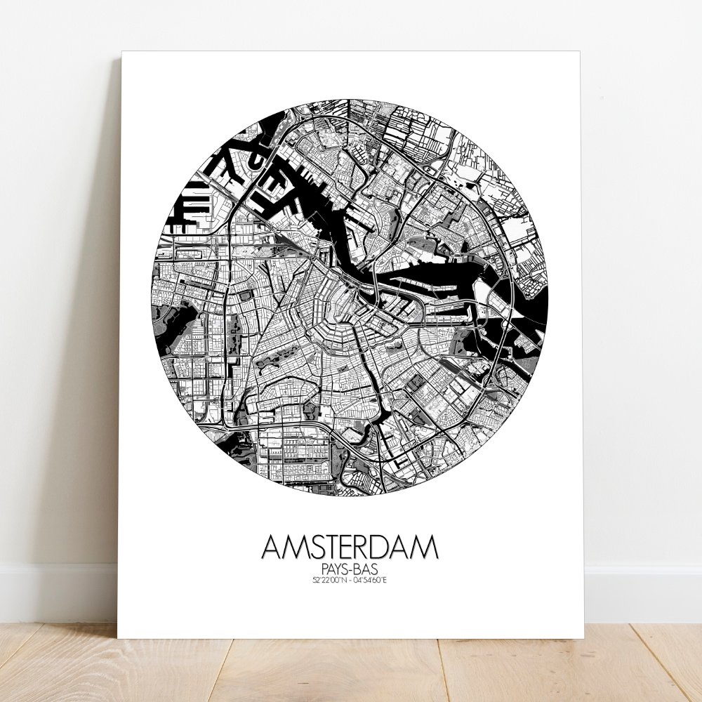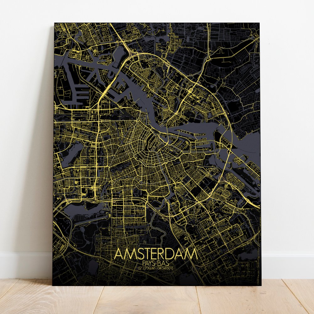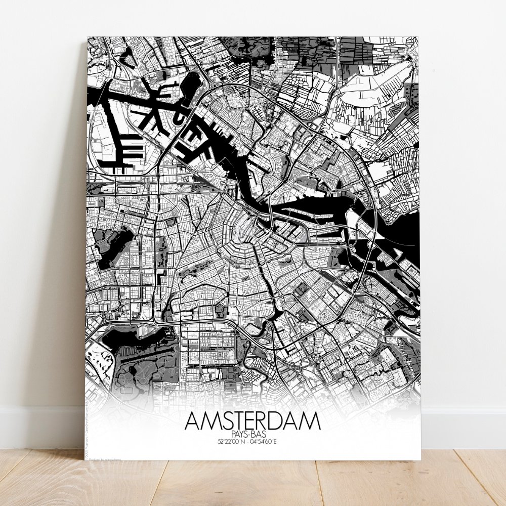 Cette City Map révèle la géométrie gracieuse des canaux — ces demi-lunes entrelacées qui donnent à la ville l’allure d’un dessin tracé au compas par quelqu’un qui aime se perdre lentement. Le relief est bien sûr célèbre pour sa platitude, comme si la terre avait cessé de débattre avec la mer et décidé de rester humblement au ras de l’eau. Vue d’en haut, on distingue le Grachtengordel, la ceinture historique des canaux, enveloppant le centre ancien telle une collerette de dentelle. La carte capture chaque courbe élégante et chaque pont, du majestueux Herengracht au plus animé Jordaan, où les entrepôts autrefois animés par le commerce vibrent aujourd’hui au rythme des vélos et des baristas. Plus au sud, le Vondelpark s’étend comme le jardin arrière d’Amsterdam — un lieu où les habitants prennent le soleil près des canards et où les seules collines sont de discrètes ondulations. Et puis il y a l’IJ, la large étendue d’eau au nord, autrefois voie de passage des navires en route vers de lointains empires, aujourd’hui davantage fréquentée par les ferries et quelque cygne égaré. Les monuments de la ville émergent avec modestie sur la carte — comme le Rijksmuseum veillant sur ses trésors ou le Palais Royal, témoin de tant de cérémonies… et de pigeons. Cette carte murale offre plus que des rues et des contours ; c’est une célébration discrète d’une ville qui flotte, s’incline et parfois vacille — mais ne sombre jamais. Une façon idéale d’apporter chez vous un peu de charme néerlandais et de chaos savamment organisé.