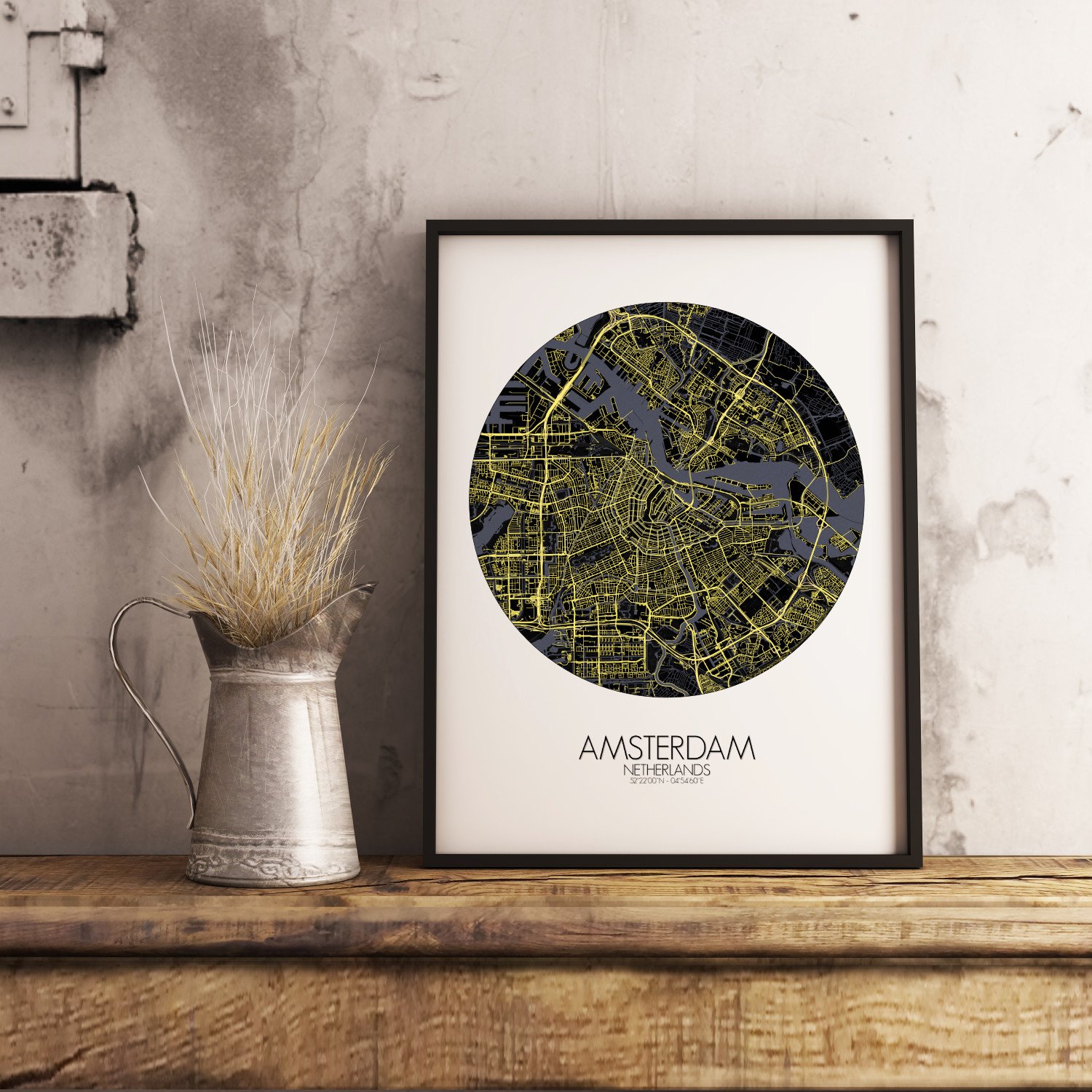 Poster City map d’Amsterdam, Pays-Bas : une ville bâtie sur l’eau et l’obstination, se déploie ici selon un motif qui déconcerterait la plupart des rivières et ravirait n’importe quel cartographe.