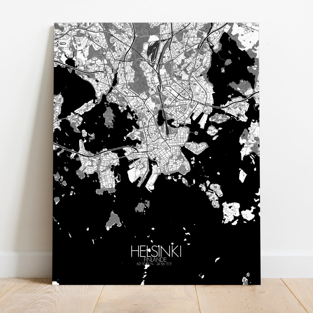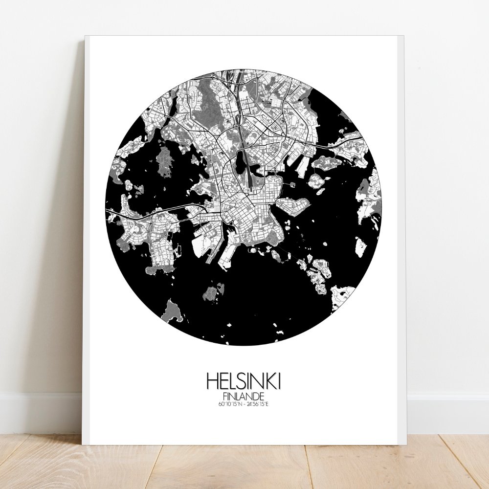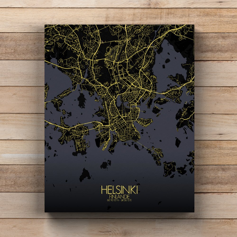 Cette carte murale capture la capitale finlandaise dans toute sa vérité topographique : les douces montées et descentes du relief, la toile d’îles dispersées comme des pièces oubliées en mer, et les forêts qui s’approchent, comme si elles hésitaient encore à reprendre la ville. Vue du ciel, Helsinki se déploie comme un équilibre soigneux entre nature et design. Ses parcs — ces oasis vert foncé, cousins lointains et gelés de Central Park — s’étendent à travers les quartiers avec la patience d’une vieille mousse. La grande baie de Töölönlahti, en forme de point d’interrogation somnolent, reflète le ciel les jours calmes, tandis que l’île forteresse de Suomenlinna repose à proximité, autrefois poste avancé obstiné, aujourd’hui conteuse silencieuse. Les flèches des églises percent l’horizon comme des points d’exclamation dans une phrase autrement stable. La cathédrale d’Helsinki, blanche, se tient fièrement au cœur de la ville, comme pour rappeler à tous qui est le maître des vues cartes postales. Pendant ce temps, l’église Temppeliaukio, taillée directement dans le roc, fait une déclaration discrète : Helsinki ne construit pas sur la terre — elle construit avec elle. Cette carte offre non seulement des rues et des bâtiments, mais la forme d’une ville encore en conversation silencieuse avec son paysage. Elle est autant un morceau de l’âme granitique de la Finlande qu’un inventaire de routes et de toits. Idéale pour le mur de quiconque s’est déjà demandé à quoi ressemble une ville qui grandit poliment, avec beaucoup de place pour les arbres.
