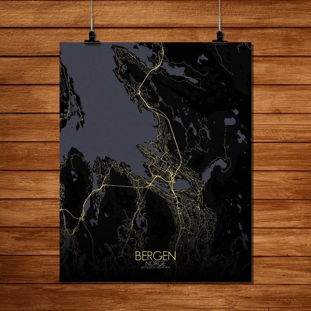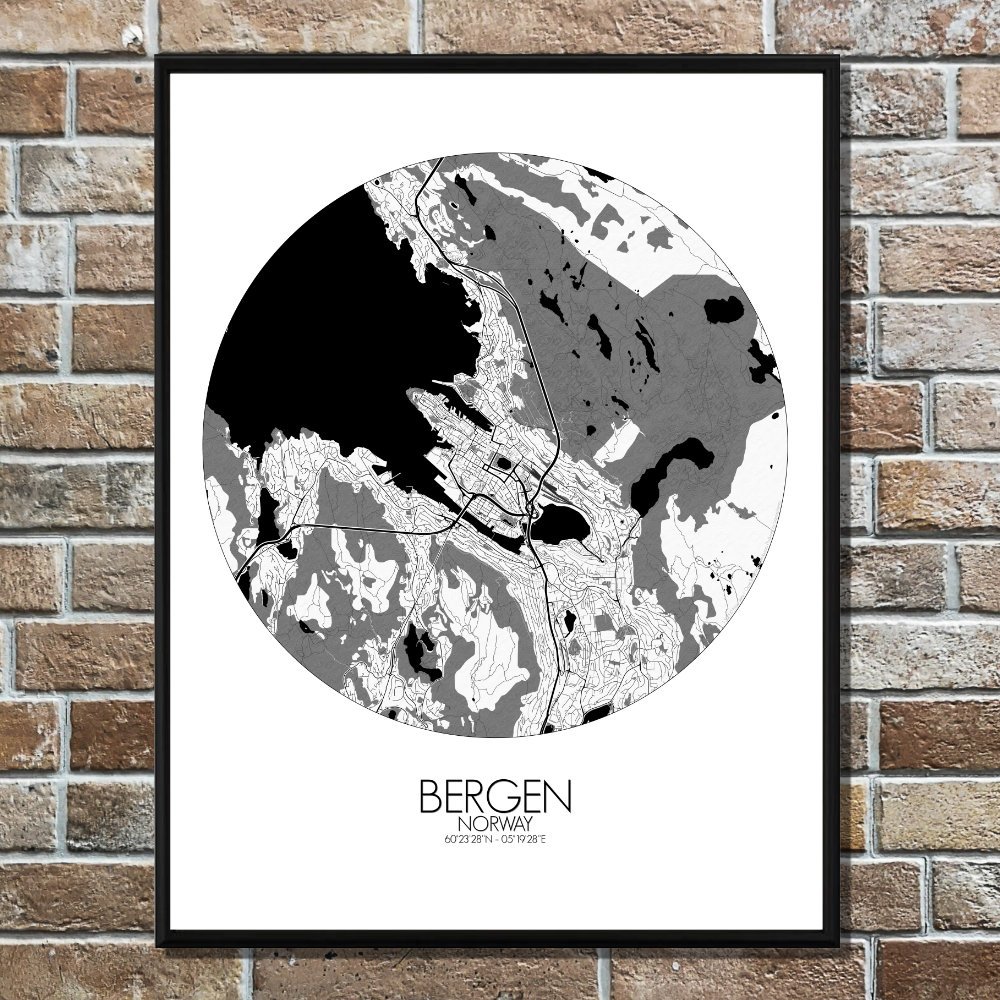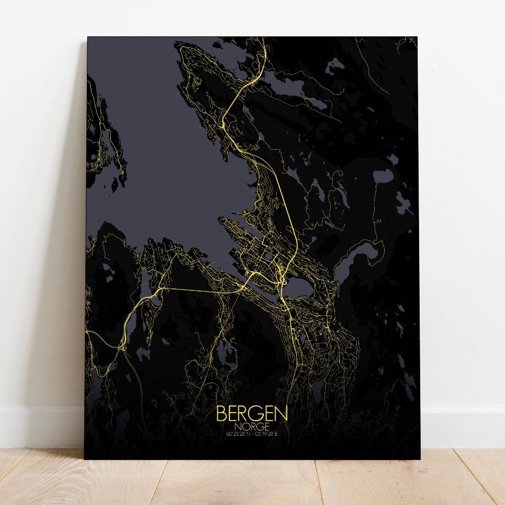Cette carte capture cet équilibre délicat — la façon dont les montagnes s’élèvent comme des sentinelles silencieuses autour de la ville, et comment les rues se tortillent comme si elles contournent poliment d’anciens chemins vikings et des arbres particulièrement têtus. Le littoral ici n’est pas lisse. Il se courbe, jaillit et se replie autour du port comme une main tenant quelque chose de précieux — ce qui, en un sens, l’est. Bryggen, l’ancien quai hanséatique, se dresse en rangée de maisons en bois colorées qui ont survécu aux incendies, aux échanges commerciaux et probablement à un certain nombre d’histoires maritimes. Sur la carte, leur emplacement est indubitable, non loin du bord du port où les mouettes tiennent conseil et où les ferries vont et viennent. En montant légèrement à l’intérieur des terres, le terrain s’élève. Vous apercevrez le mont Fløyen et ses sentiers sinueux — où les téléphériques transportent les curieux qui ne veulent pas rester en bas. Les forêts commencent ici, étendant leur vert sur les pentes comme un vieux manteau doux, accueillant les promeneurs, les trolls (si l’on croit les locaux) et le skieur de fond égaré en juillet. Des ruisseaux traversent la ville, les parcs interrompent les toits et les lacs reposent dans les replis du terrain comme de silencieuses pauses. Cette carte montre Bergen non seulement comme une ville, mais comme un lieu façonné par l’eau, le bois et le climat — où le brouillard drape les toits comme une couverture de laine et où le soleil, lorsqu’il apparaît, semble une petite célébration. Sur le mur, ce n’est pas seulement une carte. C’est un aperçu de l’âme de la côte ouest de la Norvège — un peu rude, un peu poétique, et toujours prête pour la pluie.