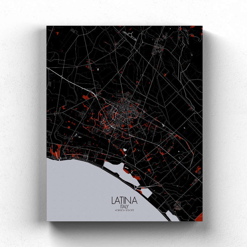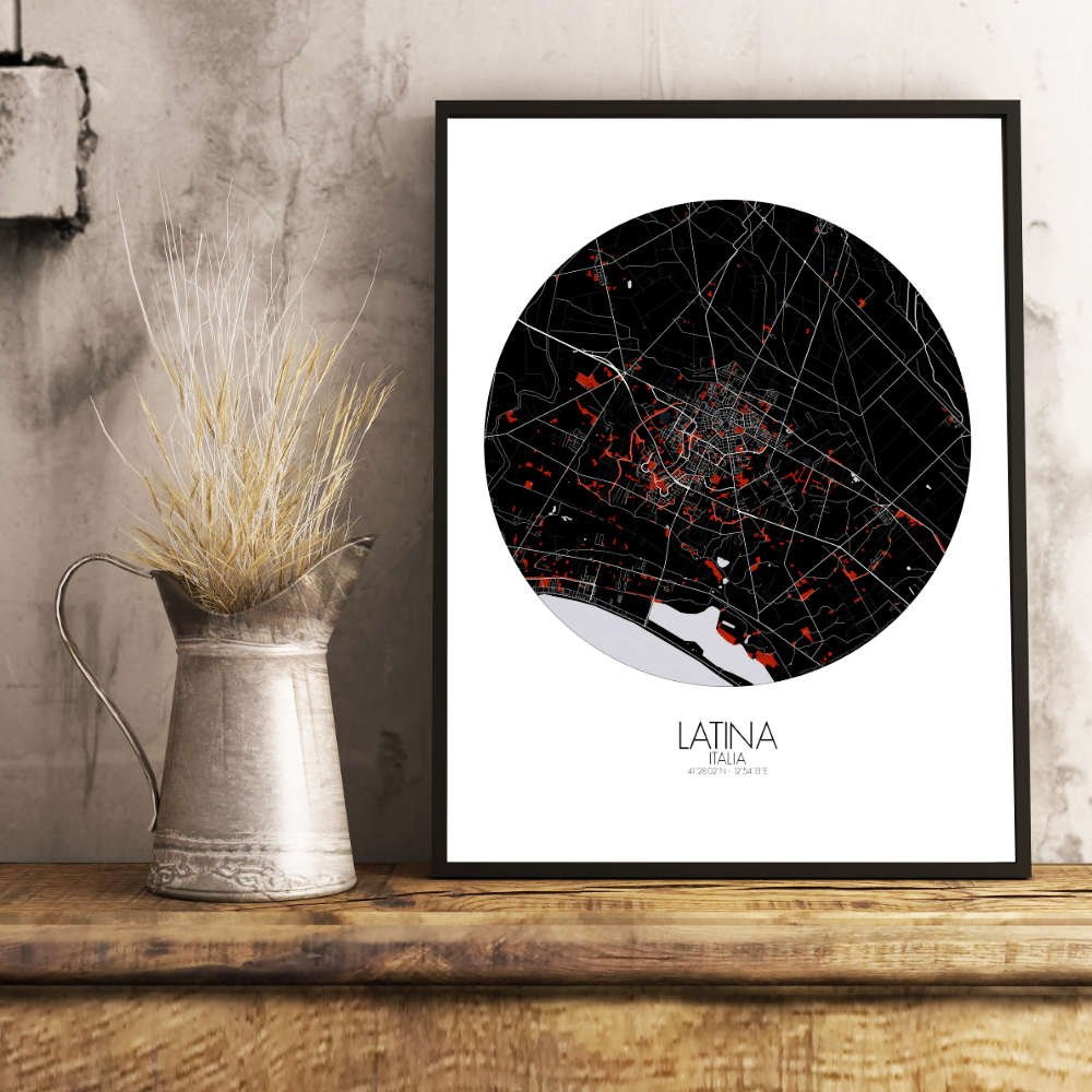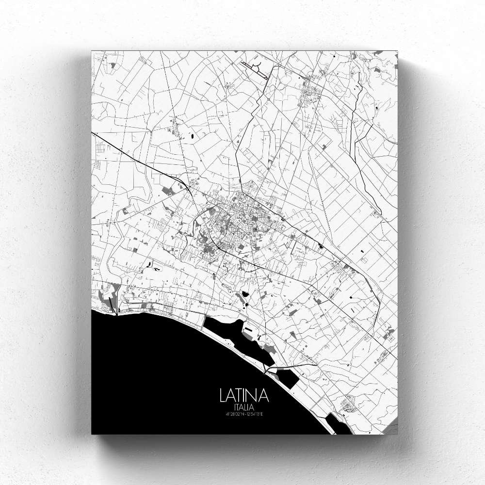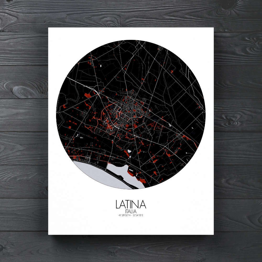 Située au cœur de l’Agro Pontino, vaste plaine autrefois marécageuse et hostile, Latina se trouve entre la mer Tyrrhénienne à l’ouest et les douces pentes des montagnes des Lepini à l’est. Le paysage plat de la ville, résultat d’un long processus de drainage, témoigne de la résilience de l’Italie à transformer le territoire, en faisant de ce qui était autrefois une zone marécageuse des terres fertiles et productives. La carte capture la grille étendue des rues qui définissent l’agencement de la ville, conséquence directe de son urbanisme au début du XXe siècle. Latina a été fondée en 1932 sous le régime de Mussolini dans le cadre d’un vaste projet de drainage et de repeuplement des marais. Ses rues, larges et ordonnées, s’étendent à travers la plaine, offrant un sentiment de symétrie et d’organisation qui reflète son développement relativement récent. Pourtant, au sein de cette grille planifiée, on trouve des poches de verdure — parcs, jardins et avenues bordées d’arbres — qui intègrent la beauté naturelle de la région à l’environnement urbain. Le terrain environnant est tout aussi captivant. À l’ouest, la plaine côtière mène aux rivages de la mer Tyrrhénienne, avec les plages proches de Latina qui constituent une escapade prisée pour échapper à la chaleur de la ville. À l’est, les collines montantes des Lepini offrent un arrière-plan spectaculaire, tout en influençant le climat et la vie agricole de la région.
