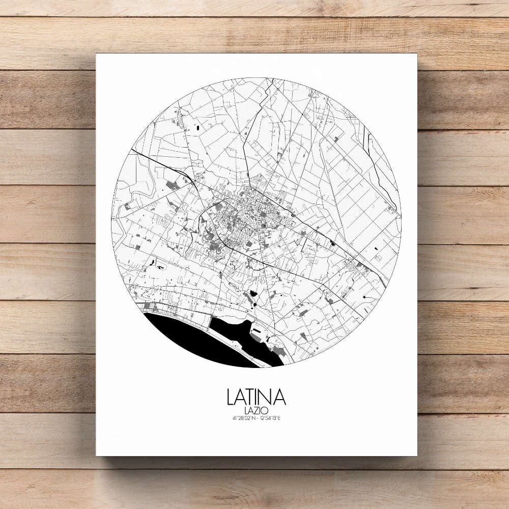 Poster City Map de Latina, Italie : la carte met en évidence la juxtaposition des éléments naturels, où l’étendue plane de la plaine rencontre l’élévation montagneuse à l’horizon, offrant une vue pittoresque des paysages variés de la région.