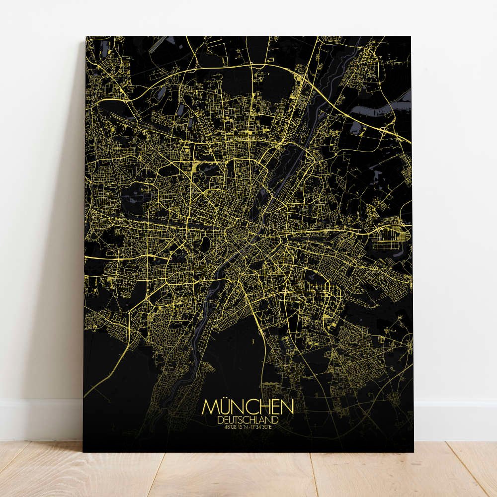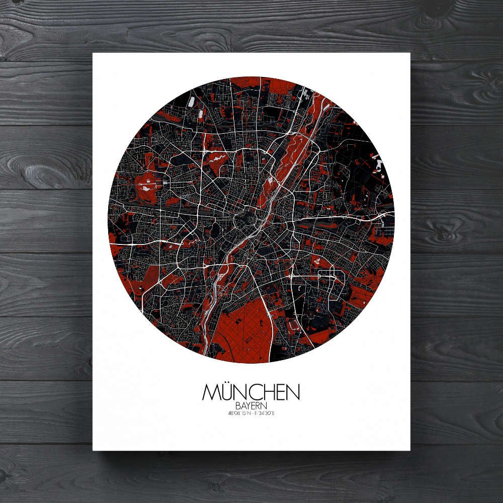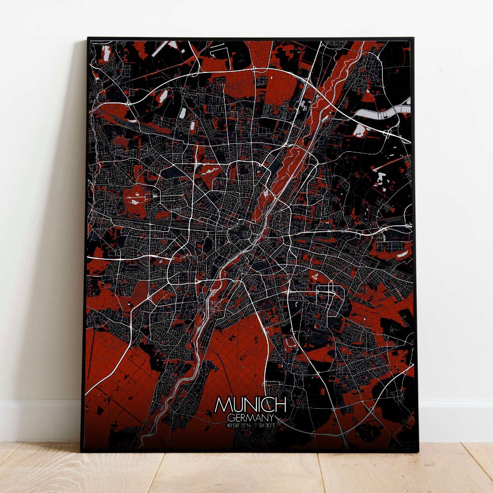 Parlons d’abord du relief. Munich est comme un terrain de jeu offert par la nature, avec l’Isar qui serpente à travers la ville tel un paisible méandre, apportant une touche de charme aquatique au paysage. Et ces Alpes à l’horizon, dressées fièrement comme les gardiens de la beauté bavaroise, vous invitant à explorer leur majesté sauvage. Vous découvrirez l’Englischer Garten, une oasis de verdure au cœur de la ville où l’on se promène parmi les arbres majestueux et les étangs sereins. C’est comme entrer dans un conte de fées, avec pique-niques et peut-être quelque lutin en lederhosen dissimulé dans les fourrés. Et n’oublions pas les lieux emblématiques ! De l’iconique Frauenkirche, avec ses deux coupoles en forme d’oignon s’élançant vers le ciel, à l’animée Marienplatz, où le Glockenspiel offre un spectacle qui enchante les yeux autant que les oreilles. Avec Mapospheres, chaque rue est un trait de génie, chaque parc une palette de verts, et chaque monument un chef-d’œuvre à part entière. Alors pourquoi se contenter d’une carte ordinaire quand on peut accrocher au mur un fragment de la magie munichoise ? C’est la cartographie réinventée, avec une bonne dose de charme bavarois !