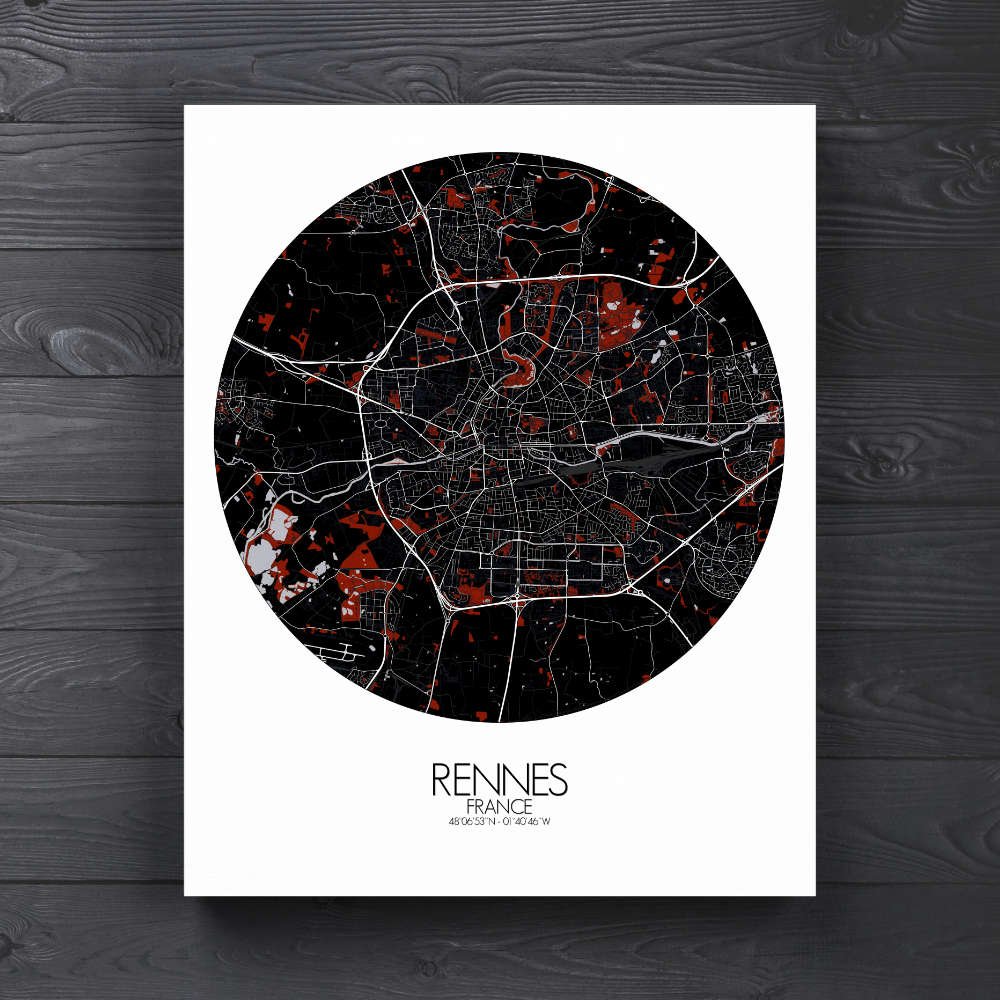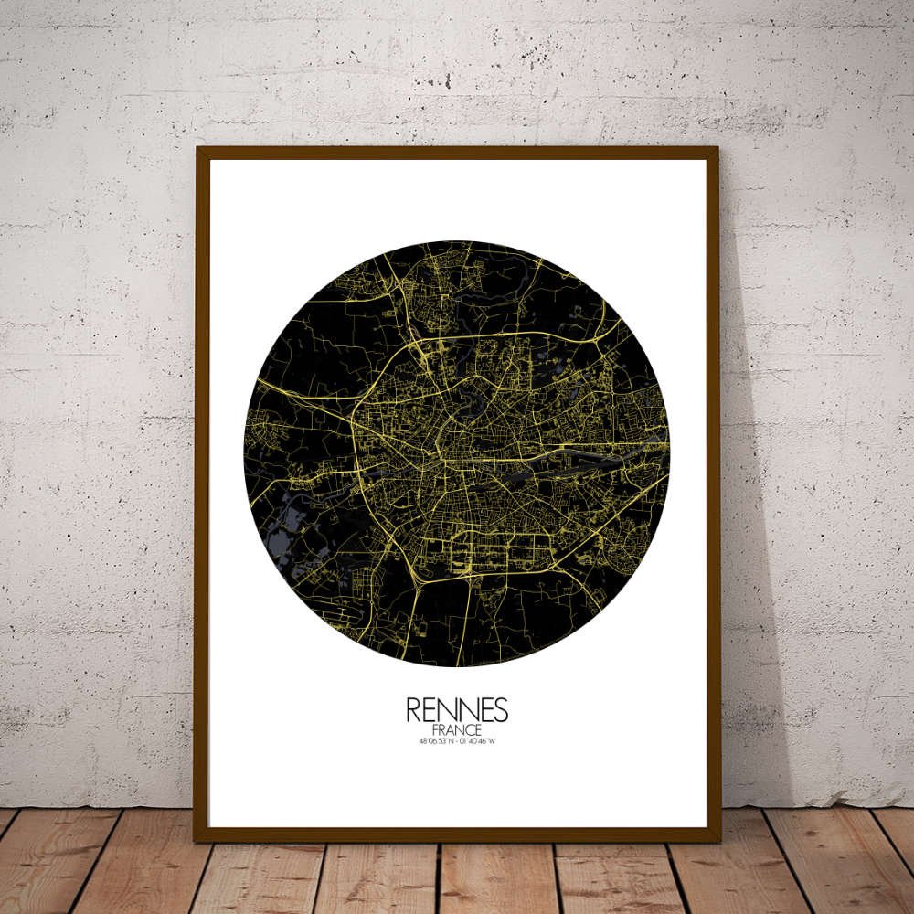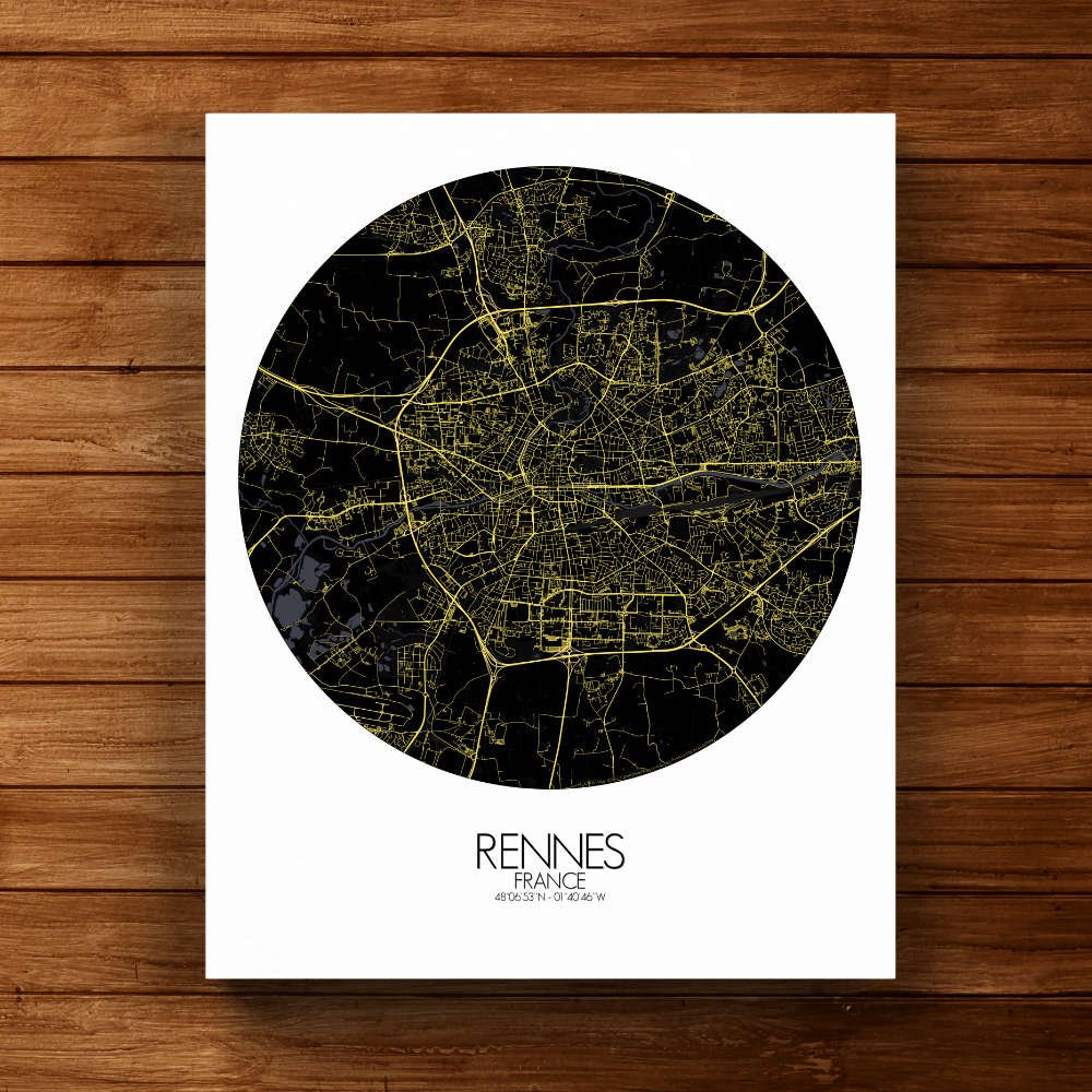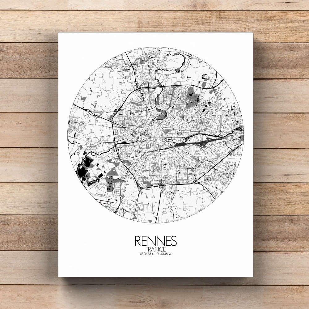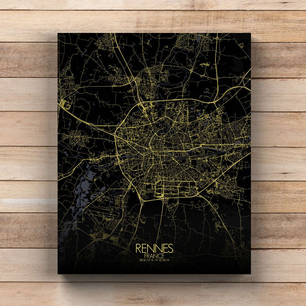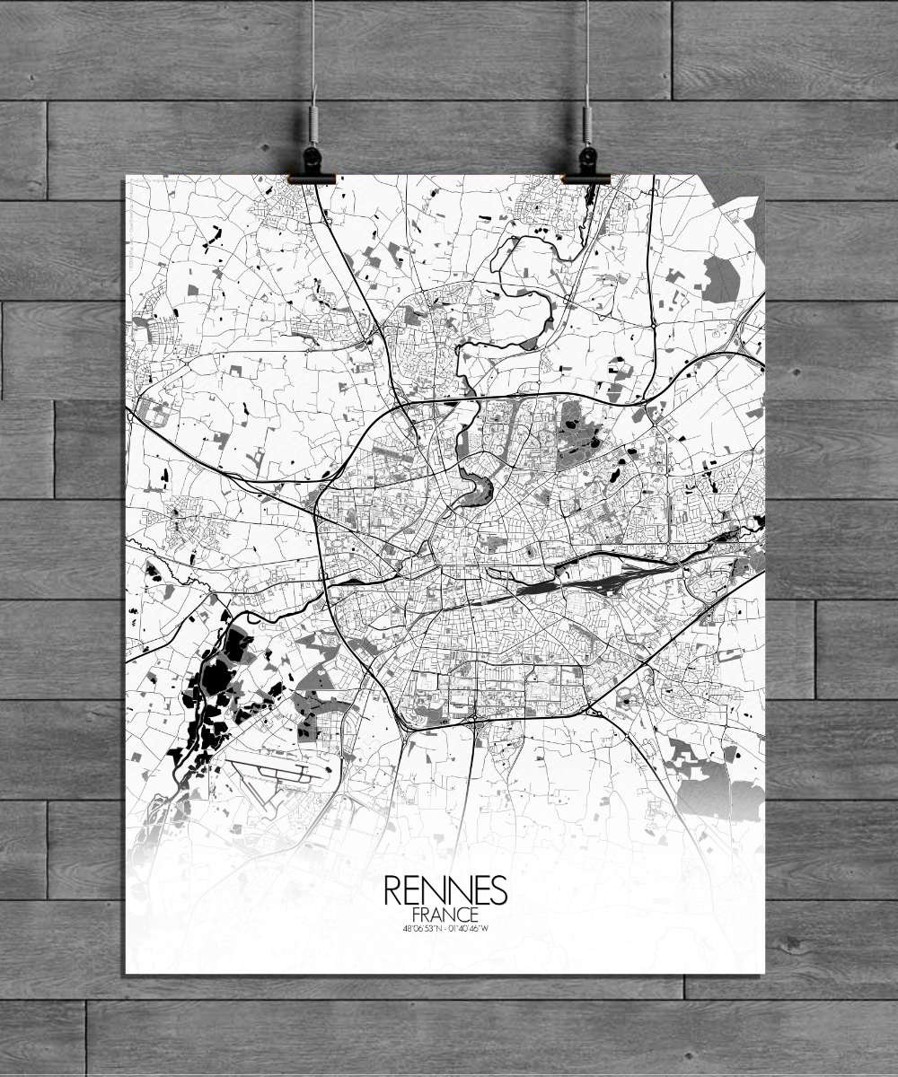 Achetez une City Map – Carte de ville murale – imprimée de la ville de Rennes, France.