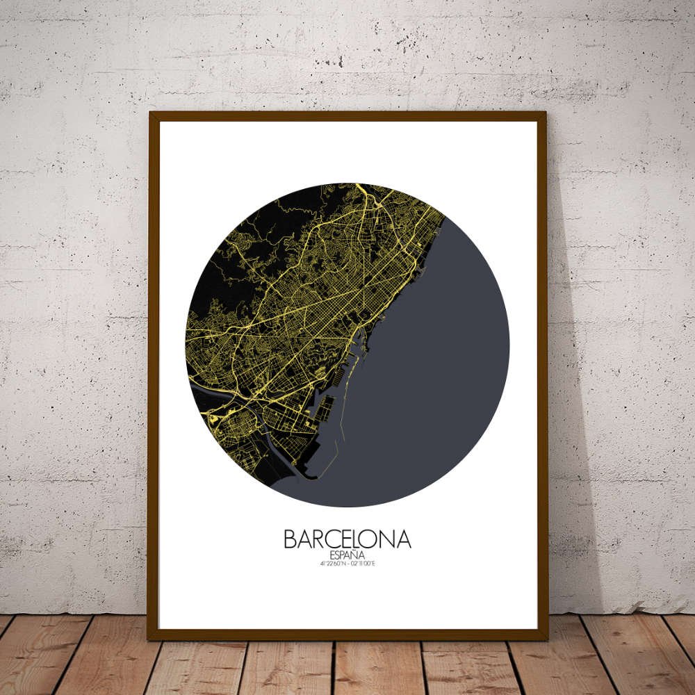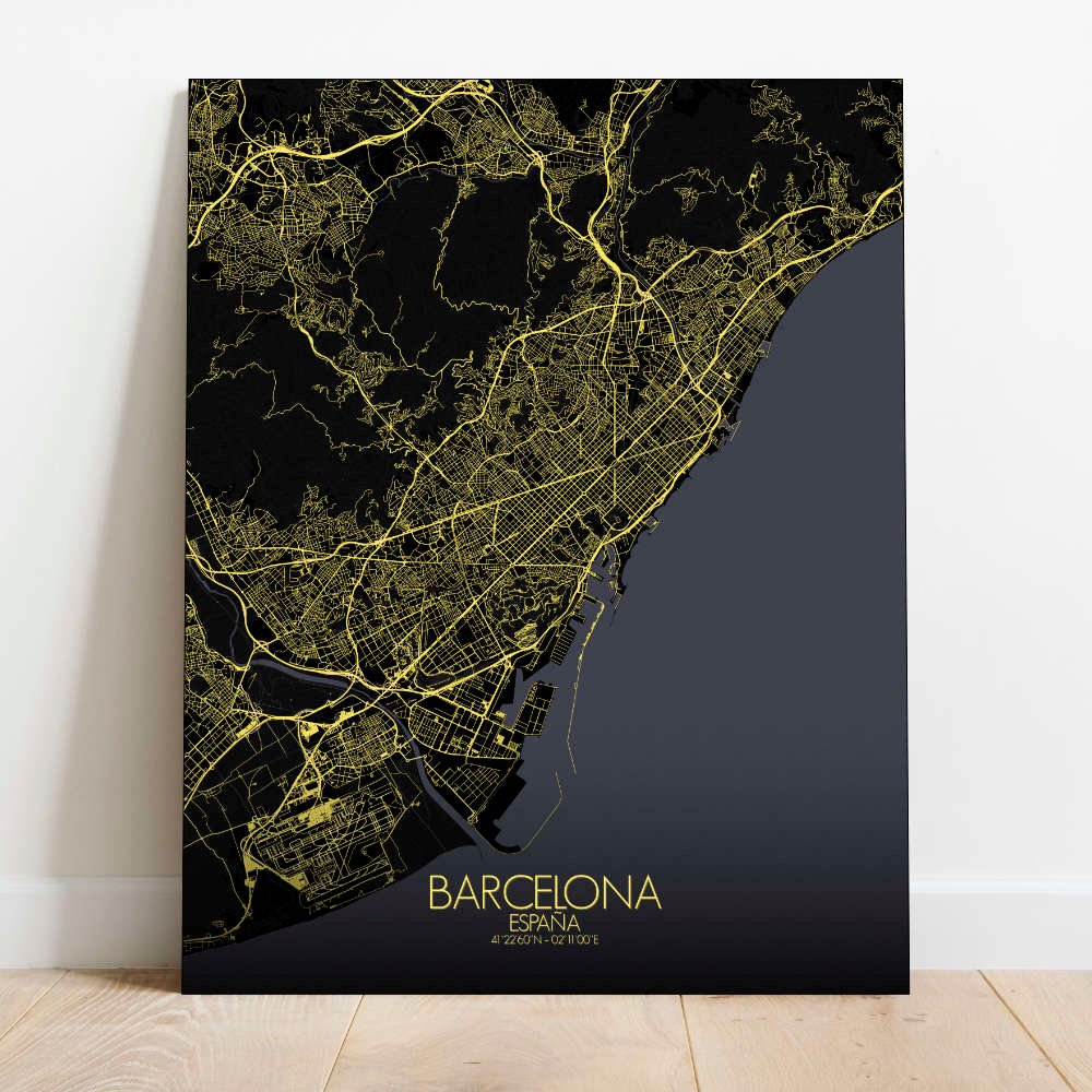 This City map captures that balance with calm precision—the blue sweep of the Mediterranean hugging the city’s edge, and the green shoulders of Montjuïc and Tibidabo rising gently behind, as if the land itself leaned in for a better view. From above, the city’s famous grid in the Eixample district looks like someone got a ruler, a compass, and a touch of obsession. Each block is carved with chamfered corners—cut neatly, not just for traffic, but for sunlight and elegance. And right in the middle of this geometrical puzzle, the Sagrada FamÃlia climbs into the sky like a cathedral that forgot to stop growing. Even on a flat map, it seems to hum with unfinished stories. Greenspaces break up the city like pauses in a long conversation. Park Güell curls up on a hillside, full of mosaics, lizards, and the feeling that maybe Gaudà was just trying to make nature jealous. There’s also the long stretch of Ciutadella Park, with its fountains, museums, and the occasional musician pretending not to care who’s listening. Even the tree-lined avenues seem to breathe. The coastline draws a soft, steady line, with beaches that begin where the city ends. From Barceloneta’s buzzing boardwalks to the quieter sands further north, the edge of the map invites the eye toward the open sea, as it always has for sailors, traders, and daydreamers. This map of Barcelona doesn’t just mark streets and slopes—it sketches out a city that was built to be both seen and felt. Hang it on your wall, and you might start planning a siesta, a stroll, or a revolution—just as the locals have done for centuries.
