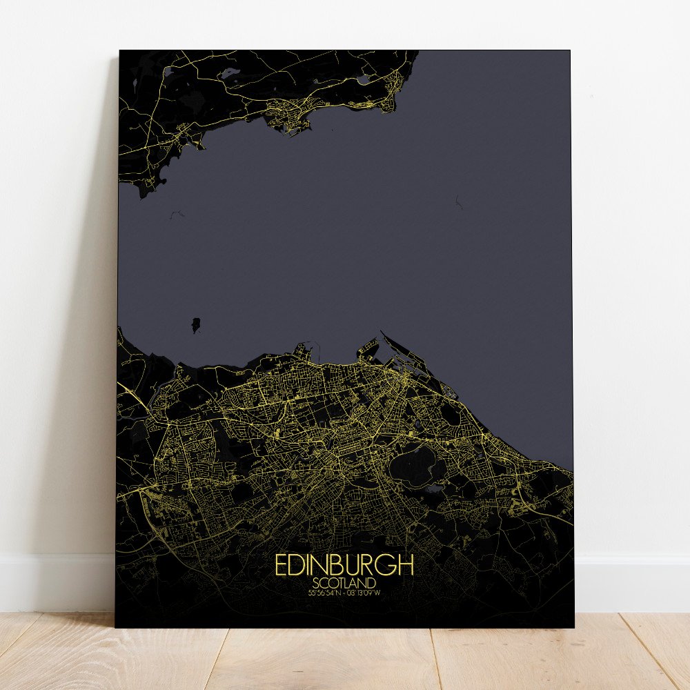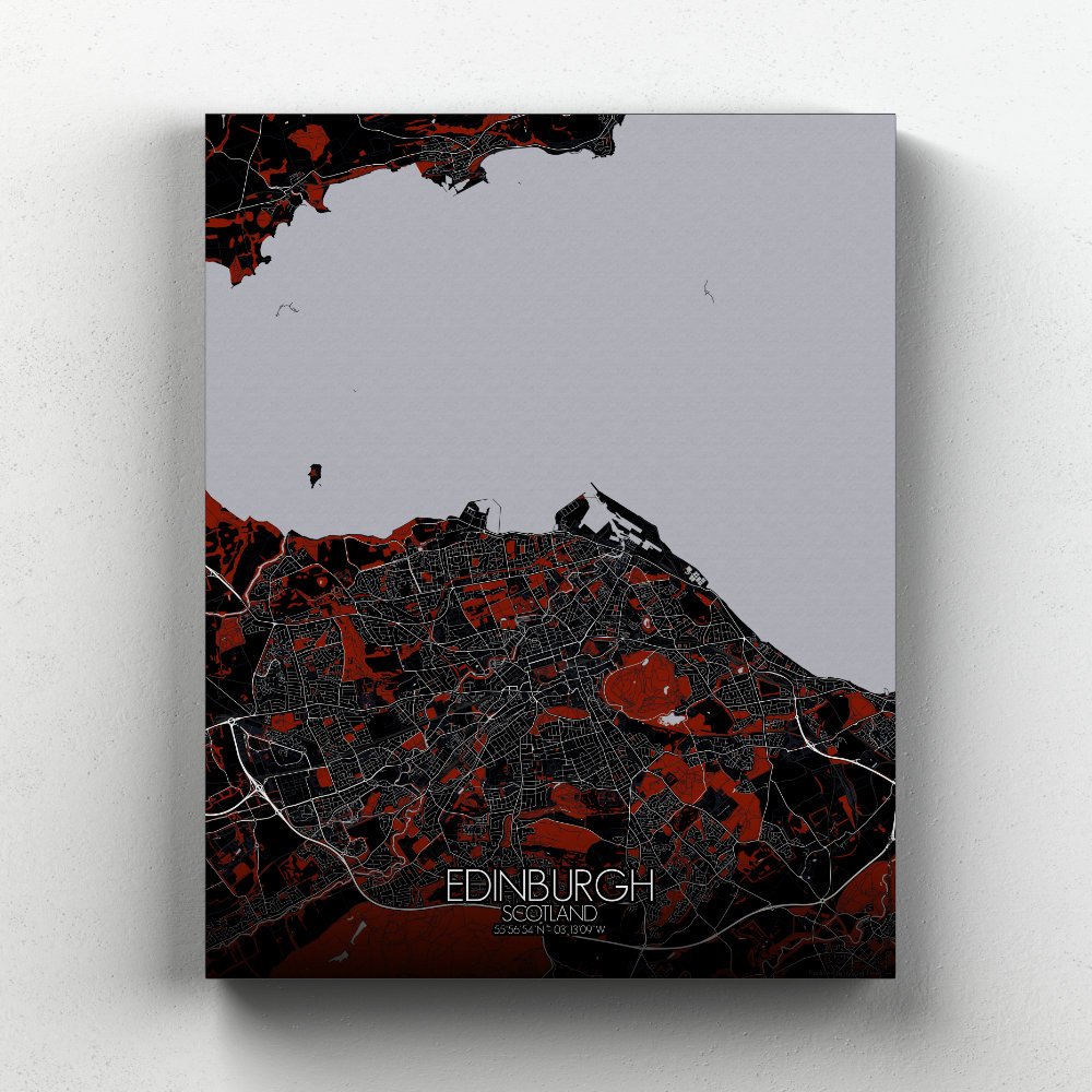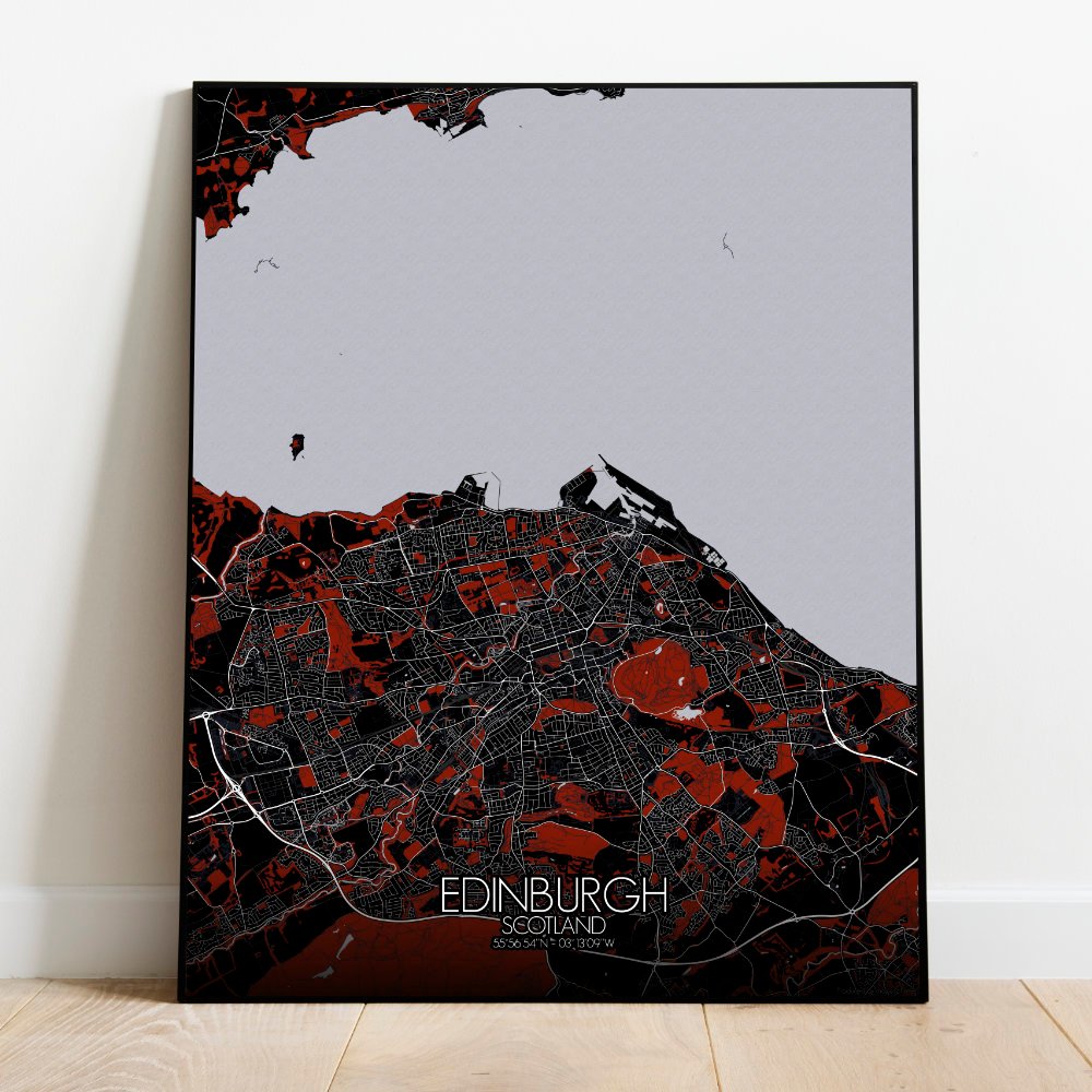 This map captures the soul of Scotland’s storied capital, shaped by ancient volcanoes and royal ambition. At the heart of it all rises Castle Rock, the bedrock throne of Edinburgh Castle, perched like a watchful guardian above the city’s winding closes and cobbled wynds. The map’s relief reveals the city’s rugged terrain, from the dramatic slopes of Arthur’s Seat — a sleeping giant of volcanic origin and local hiking fame — to the serpentine course of the Water of Leith, which glides past Dean Village like a forgotten chapter in a fairy tale. Greenspaces unfurl like old tapestries, with Holyrood Park, the Meadows, and Princes Street Gardens offering calm in the shadow of spires and stone. You’ll trace the Royal Mile’s descent from castle to palace, flanked by centuries of gossip, ghost stories, and the occasional bagpiper. The New Town’s elegant grid contrasts with the Old Town’s more improvisational charm, as if the Enlightenment tidied up after the Middle Ages. Hang it on your wall, and you might just hear the whisper of history carried on the Highland breeze. Or perhaps that’s just the wind from Arthur’s Seat.
