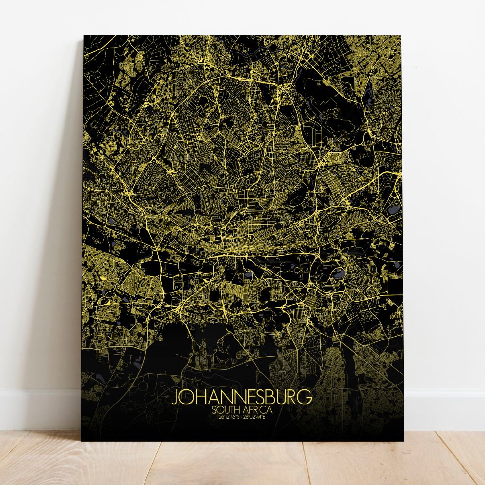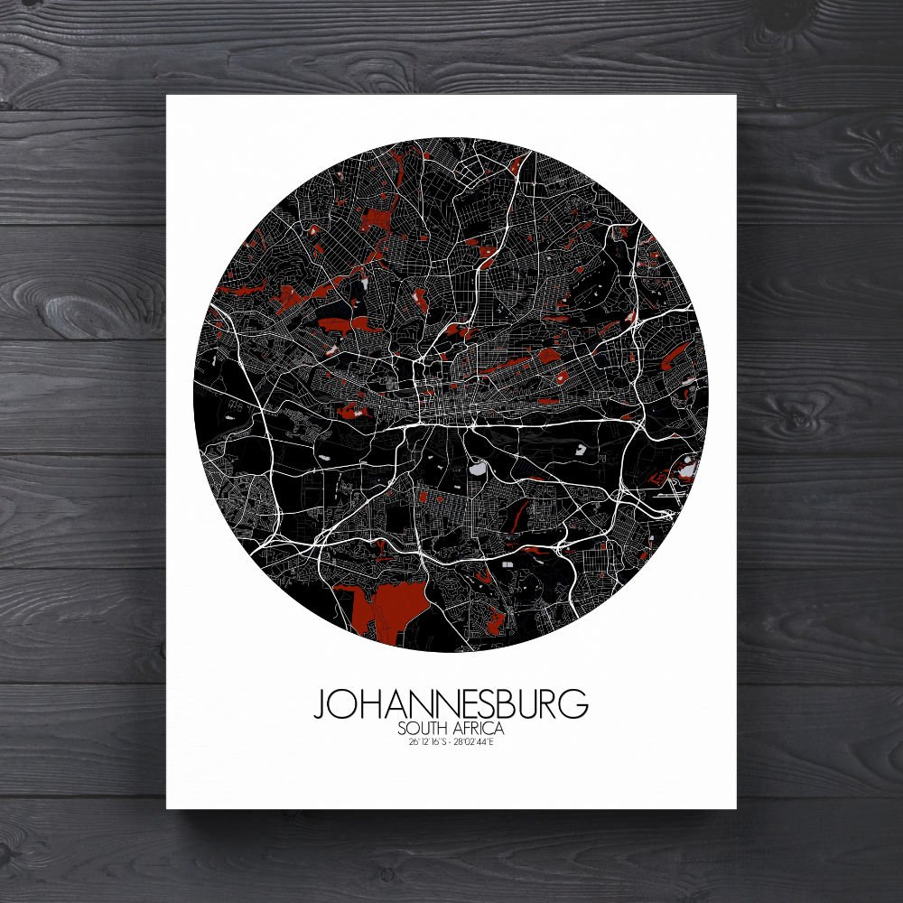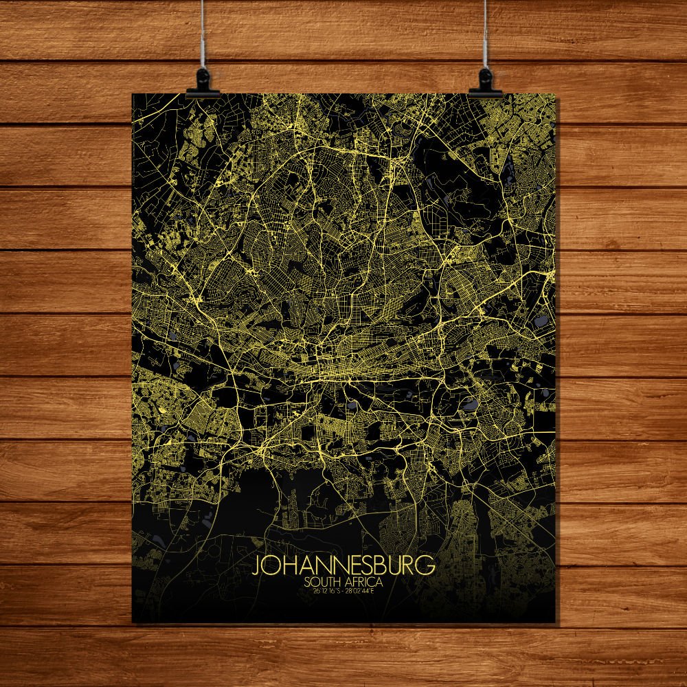 Poster City map of Johannesburg, South Africa: “Joburg” as it’s affectionately called, is a city built on the land where gold was first discovered, and this map captures the rugged beauty and dynamic spirit of the city in all its topographical detail.