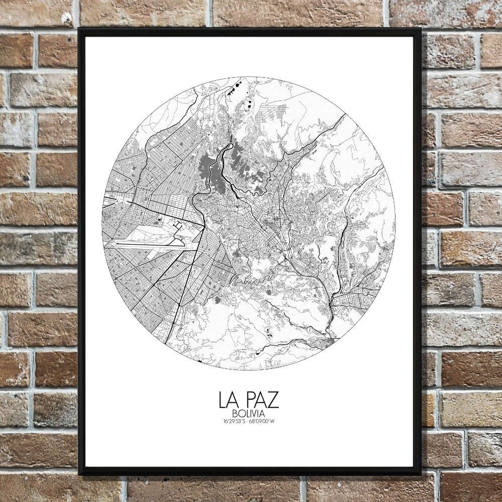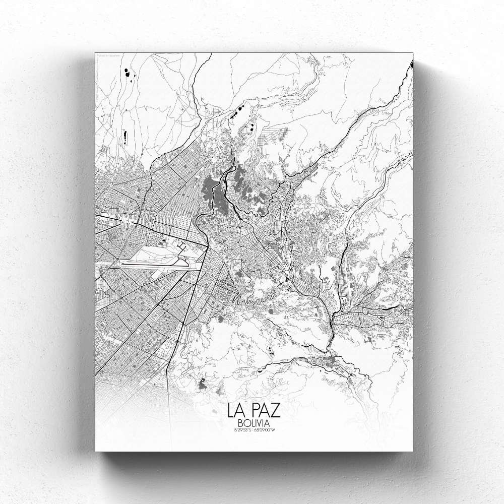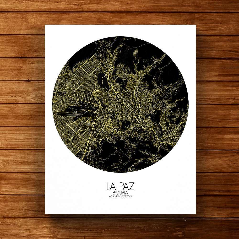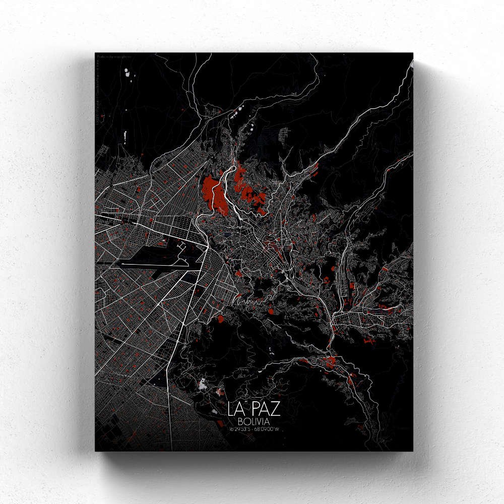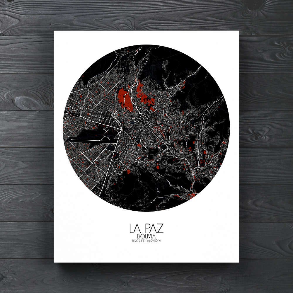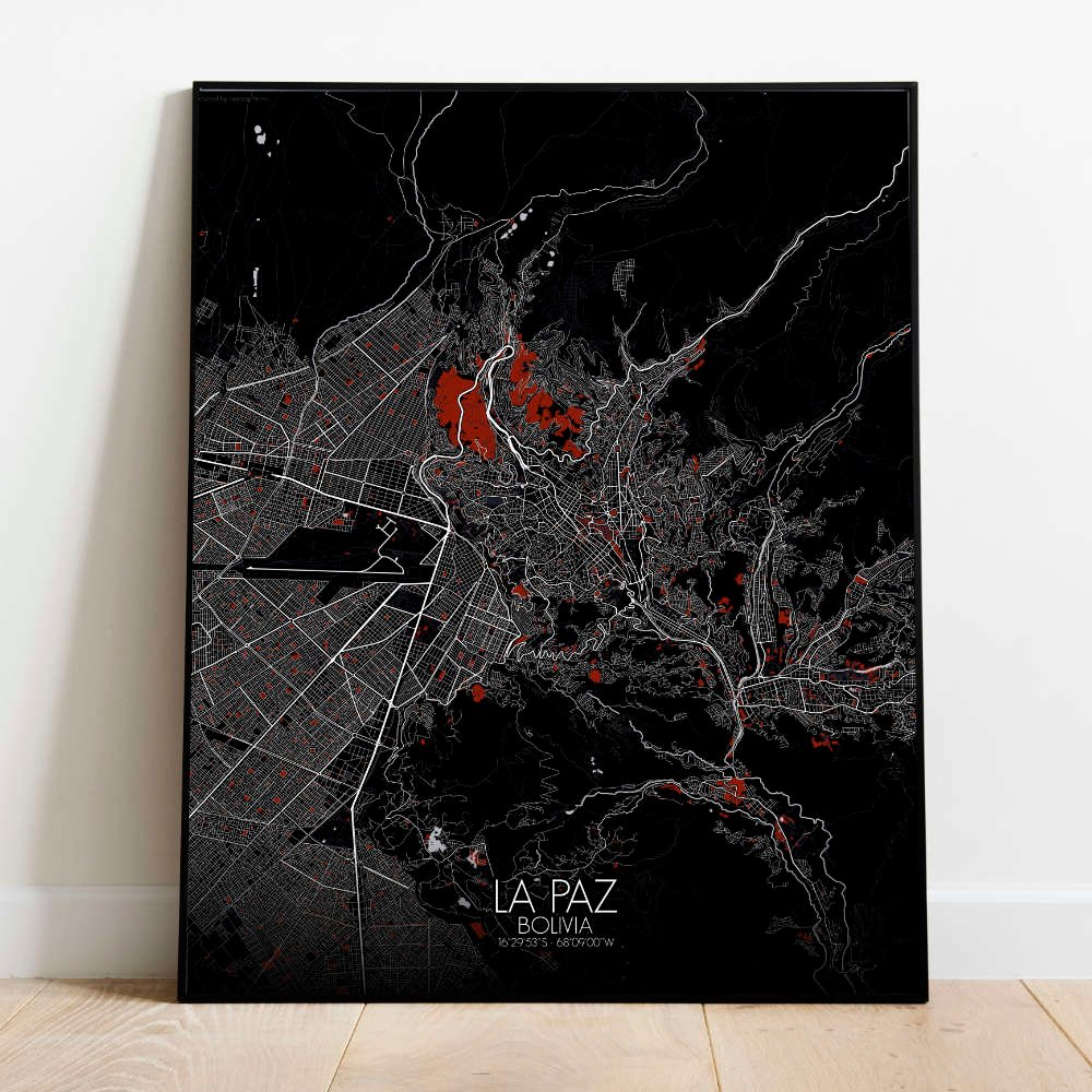 Poster City map of La Paz, Bolivia: From the historic charm of its colonial plazas to the cutting-edge cable cars that crisscross the city, connecting neighborhoods perched on different altitudes, this map tells the story of La Paz as a city rooted in the land and the stories of its people.