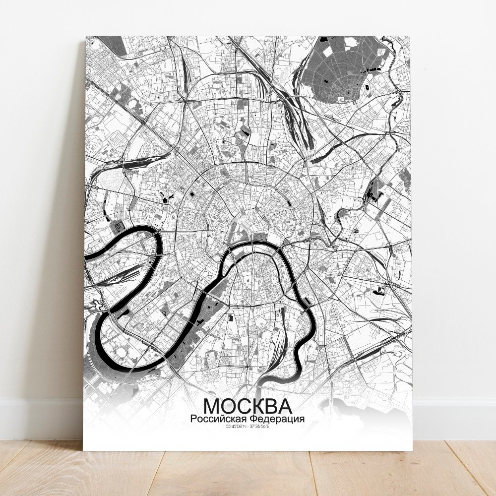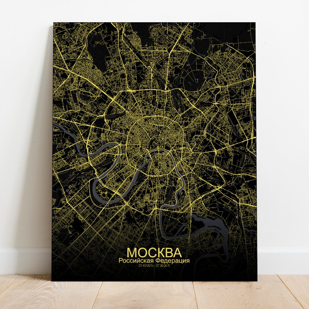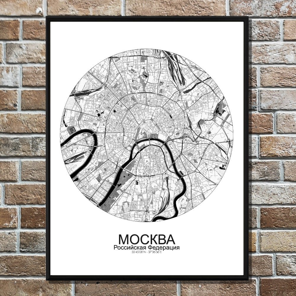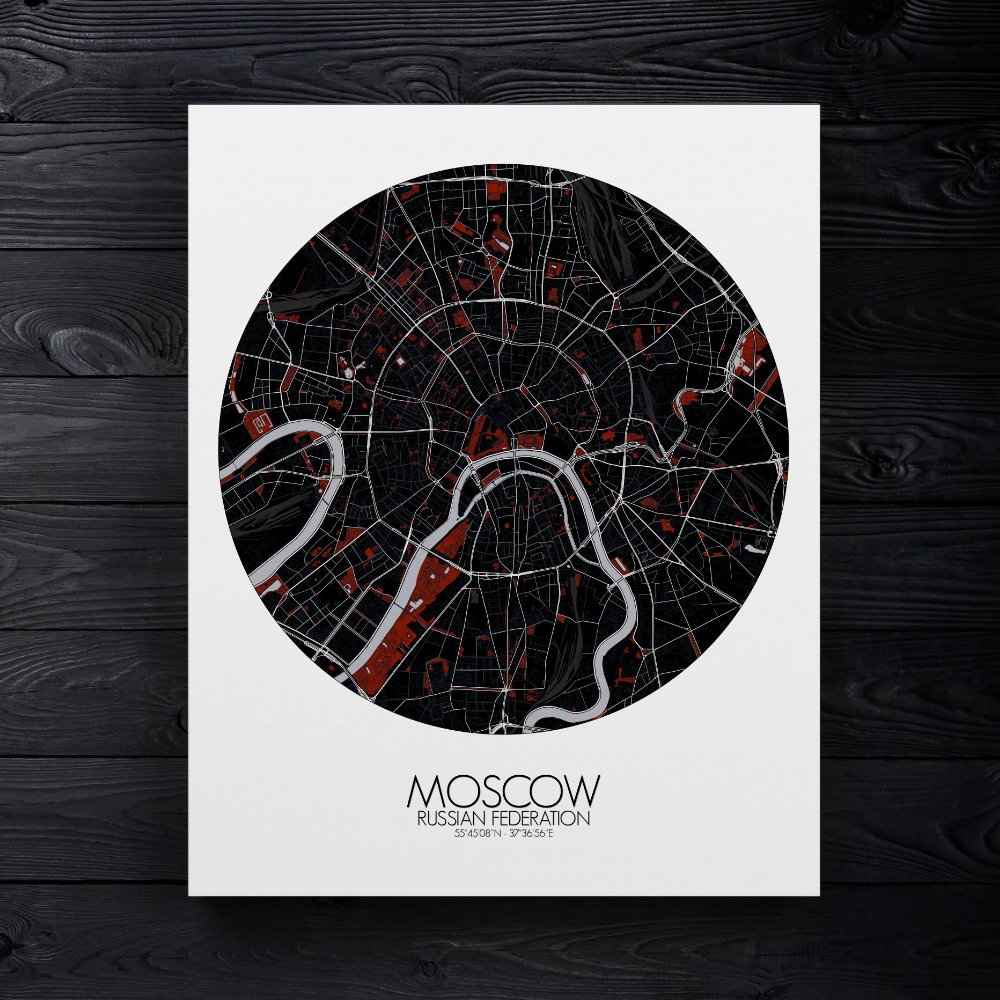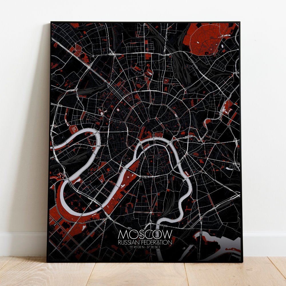 Poster City map of Moscow, Russia: Nestled along the banks of the winding Moskva River, the city of Moscow stretches out in a pattern that is anything but ordinary.