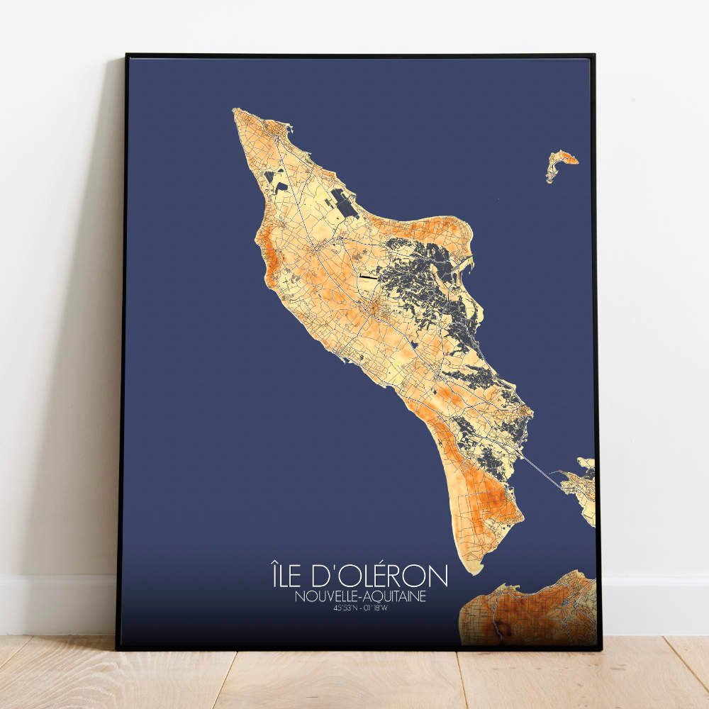 Located off the west coast of France, near La Rochelle, Oléron is known for its mix of rolling hills, expansive beaches, and rich maritime history. The map beautifully displays the island’s varied terrain, with gentle slopes and elevated areas like the forested hills in the north and the rugged dunes along the southern shores. It’s a place where the land rises and falls in subtle waves, inviting curiosity about what lies beyond the next curve of the coastline. At the heart of the map, you can trace the outlines of the island’s famous salt marshes, which have shaped its economy and history for centuries. These marshes, rich in flora and fauna, also add an elegant touch to the map’s design, their low-lying expanses contrasting with the higher points of land. The island’s dense forests, especially the beautiful Forêt de la Coubre, stand out in shades of green, offering a peaceful escape into nature. Not far from the forests, the famous lighthouse of Chassiron marks the northern tip of the island, a reliable guide for sailors through the rough waters of the Atlantic. Oléron’s long history as a haven for pirates, traders, and fishermen is etched into the land itself, from the charming old villages to the scattered fortifications. The map showcases the gently rolling hills and seaside cliffs where tales of seafaring adventures are still whispered by the wind.