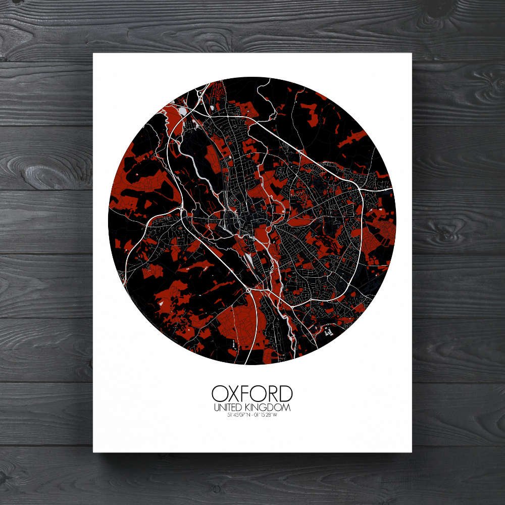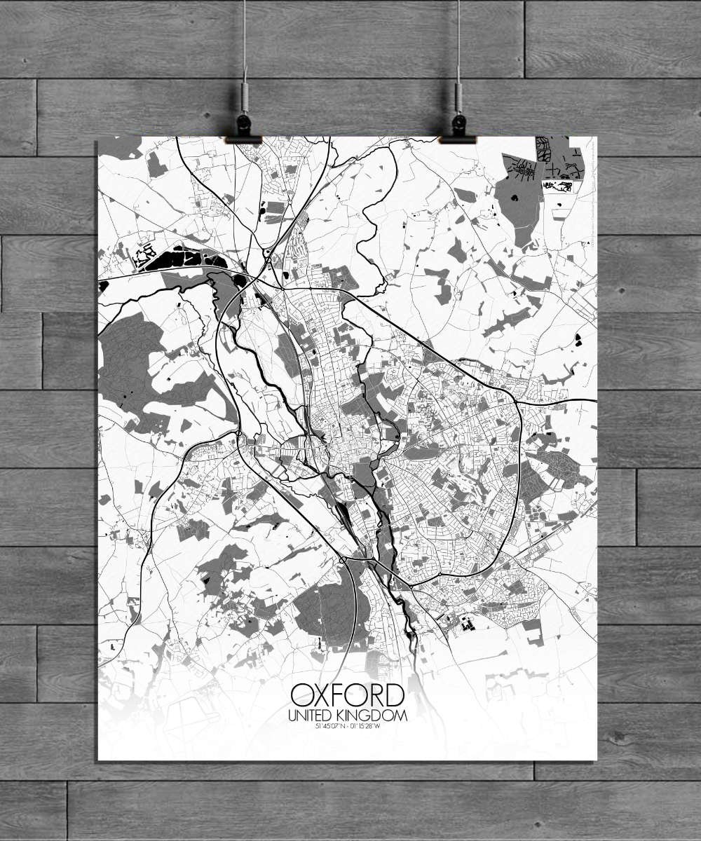 Oxford, often dubbed the “City of Dreaming Spires” is beautifully captured in this detailed city map, where topography and history meet. Nestled on the River Thames, its winding waterways and gentle hills are intricately laid out, highlighting the city’s unique blend of natural beauty and architectural splendor. The map showcases Oxford’s many green spaces, from the tranquil expanses of the University Parks to the ancient woodlands of Shotover Hill, offering a breath of fresh air amid the bustle of city life. The map’s rich detail brings to life iconic landmarks, such as the spires of the University of Oxford’s many colleges, each with its own tale to tell. The serene waters of the Thames, with its rowers gliding silently, are also captured, offering a sense of calm amidst the city’s vibrant pulse. It’s a map that doesn’t just chart streets, it traces the very essence of Oxford, making it a perfect addition to any wall where history, beauty, and a touch of whimsy can all be admired at a glance.