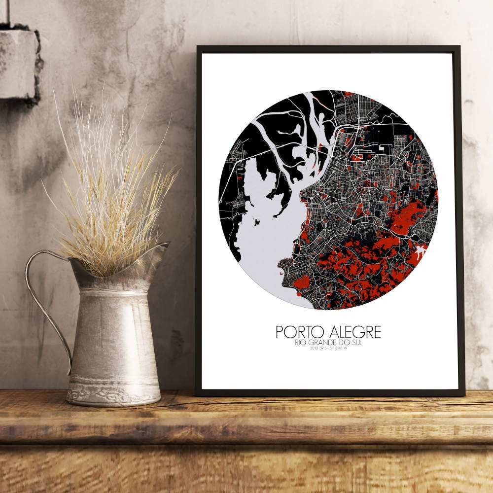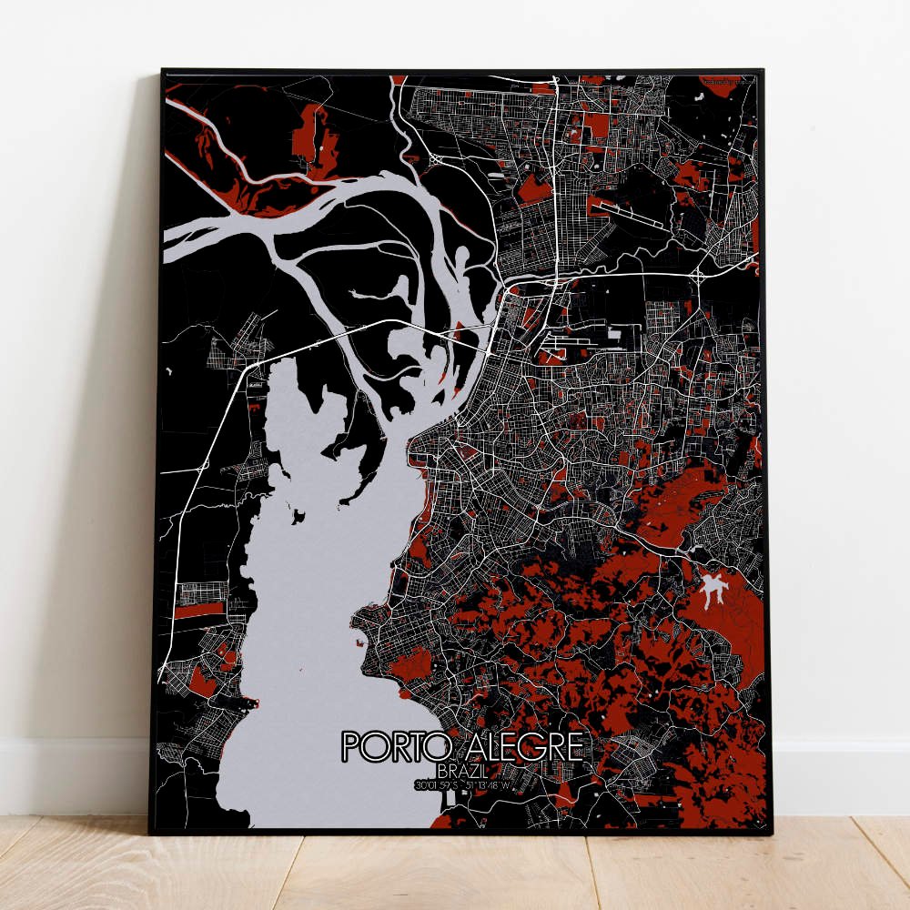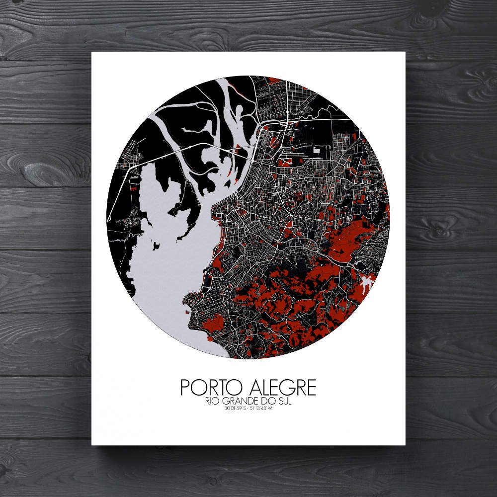 The intricate details of Porto Alegre’s geography and topography are captivating. The Guaíba River meanders through the heart of the city, like a shimmering ribbon of blue that adds a touch of serenity to the urban landscape. Observe the gentle slopes and valleys that define the city’s topography, each contour lovingly rendered to perfection. From the sprawling parks where locals gather to relax and unwind to the verdant hillsides that offer panoramic views of the city below, Porto Alegre’s greenery is as bountiful as it is beautiful. The iconic Usina do Gasômetro, its imposing silhouette is a testament to the city’s industrial heritage. Take in the grandeur of the Metropolitan Cathedral, its soaring spires reaching towards the heavens with an air of timeless grace. Mapospheres is a good mix of mapmaking and design. We created a 3 distinct design series (RED DARK, BLACK AND WHITE and NIGHT) of PRINT Artwork which emphasizes the inner green spaces in world cities. Large-sized format City Maps printed on demand and easy to order!