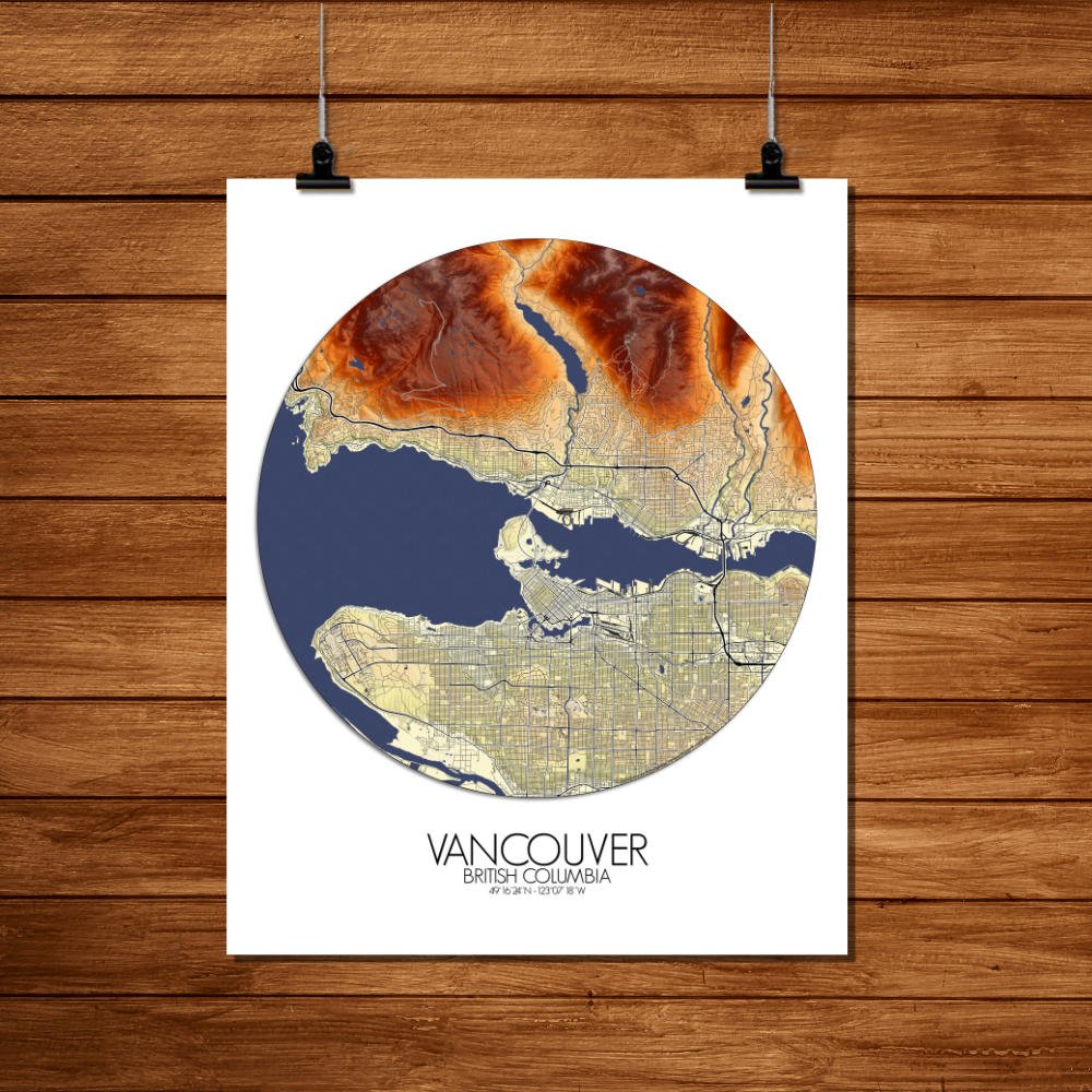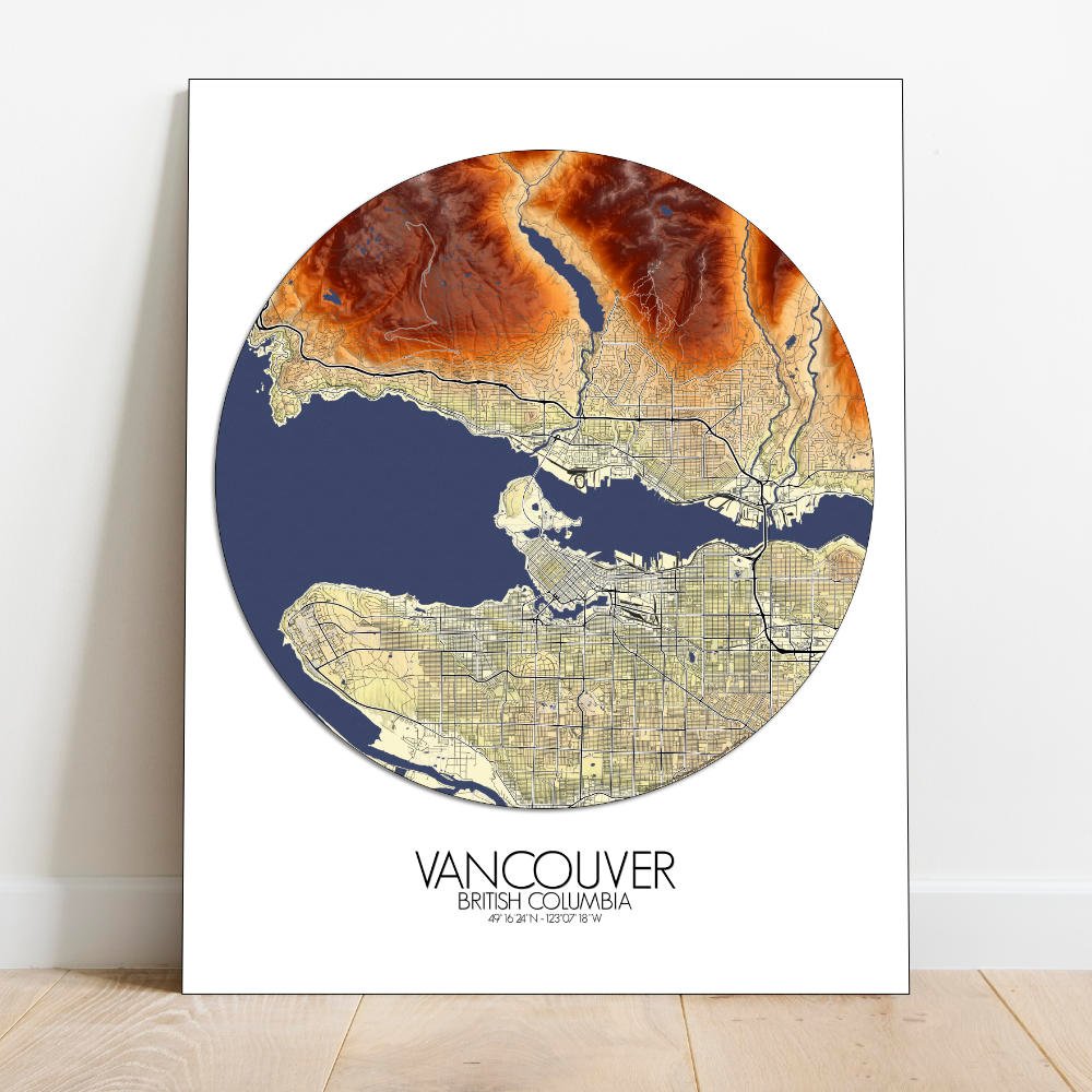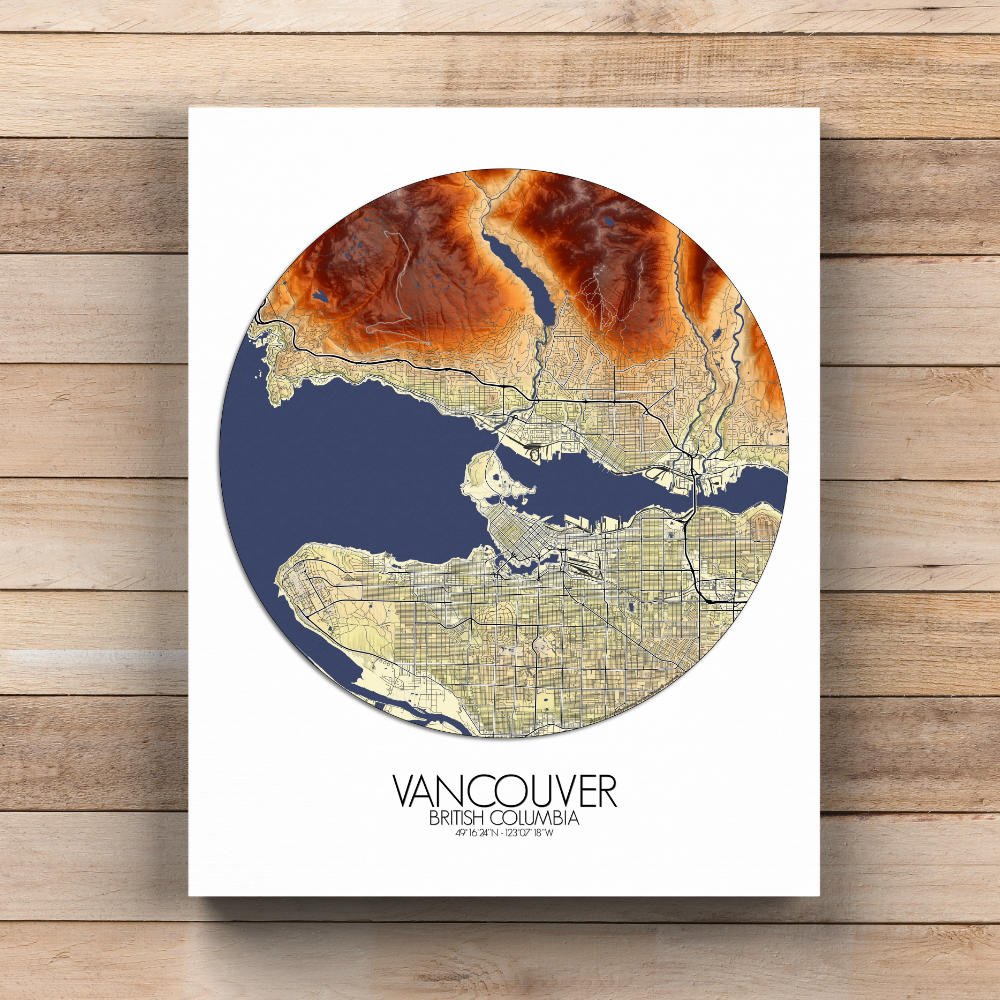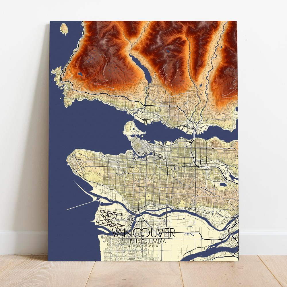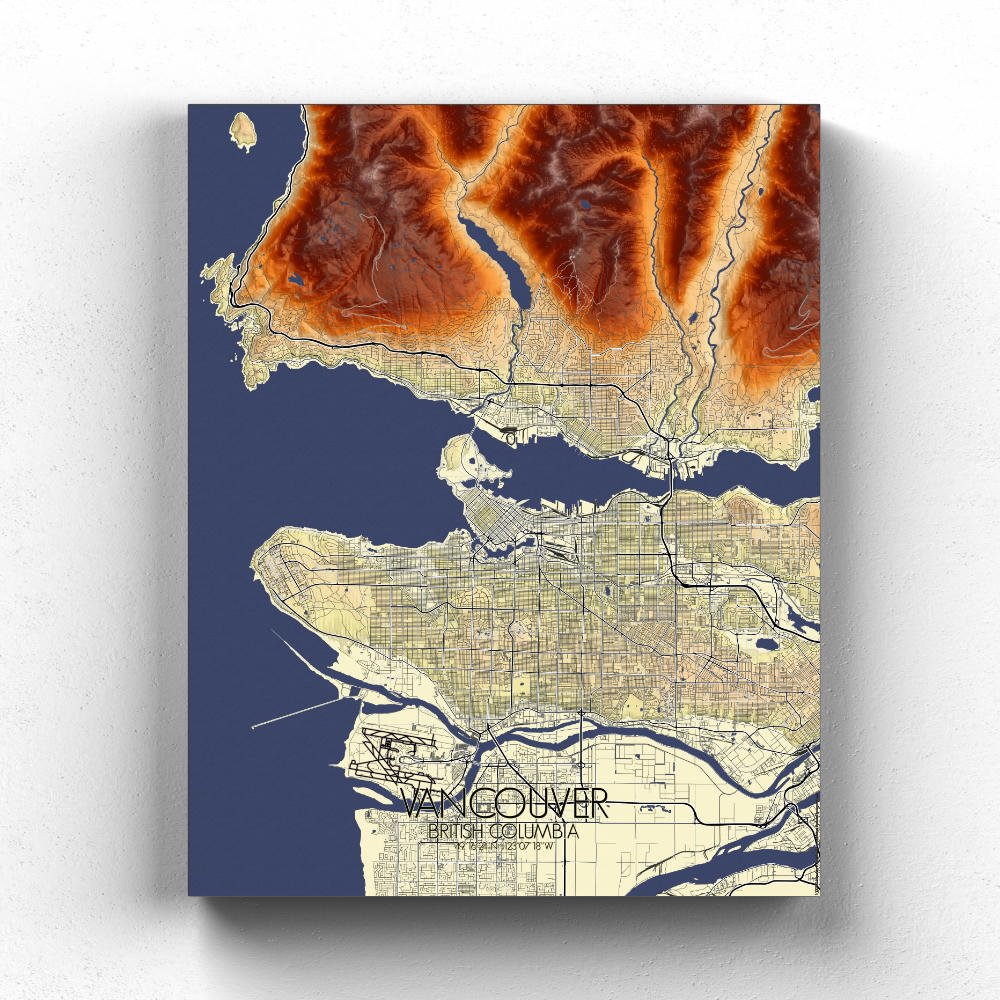 Elevation map poster of Vancouver, BC, Canada: In this wondrous creation, the contours of the land come alive, telling tales of rugged mountains, serene greenspaces, and bustling urban landscapes.