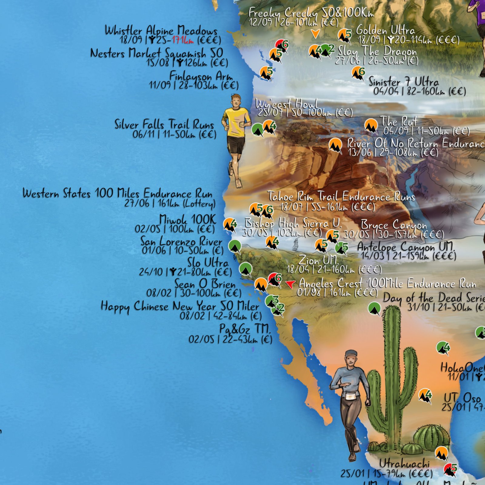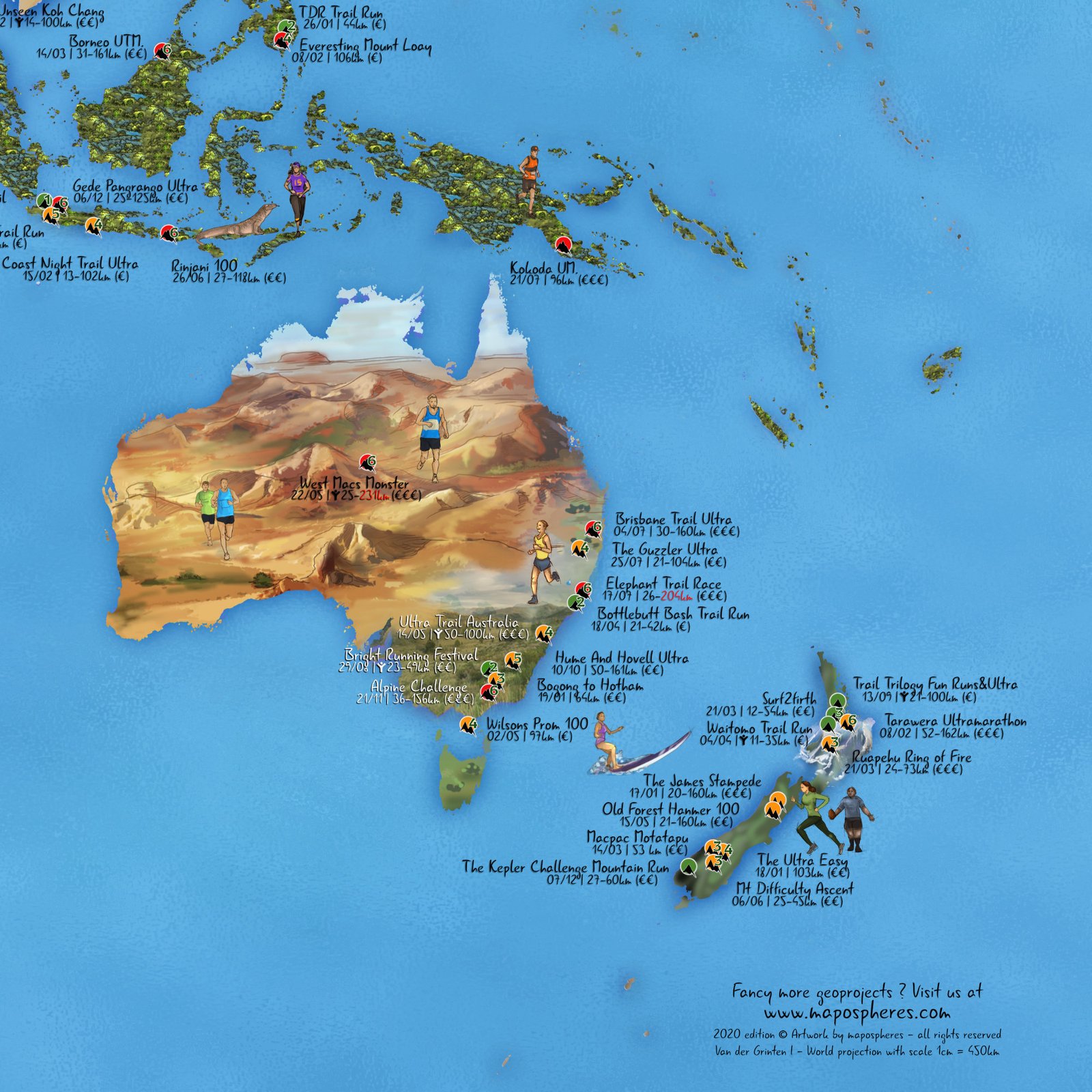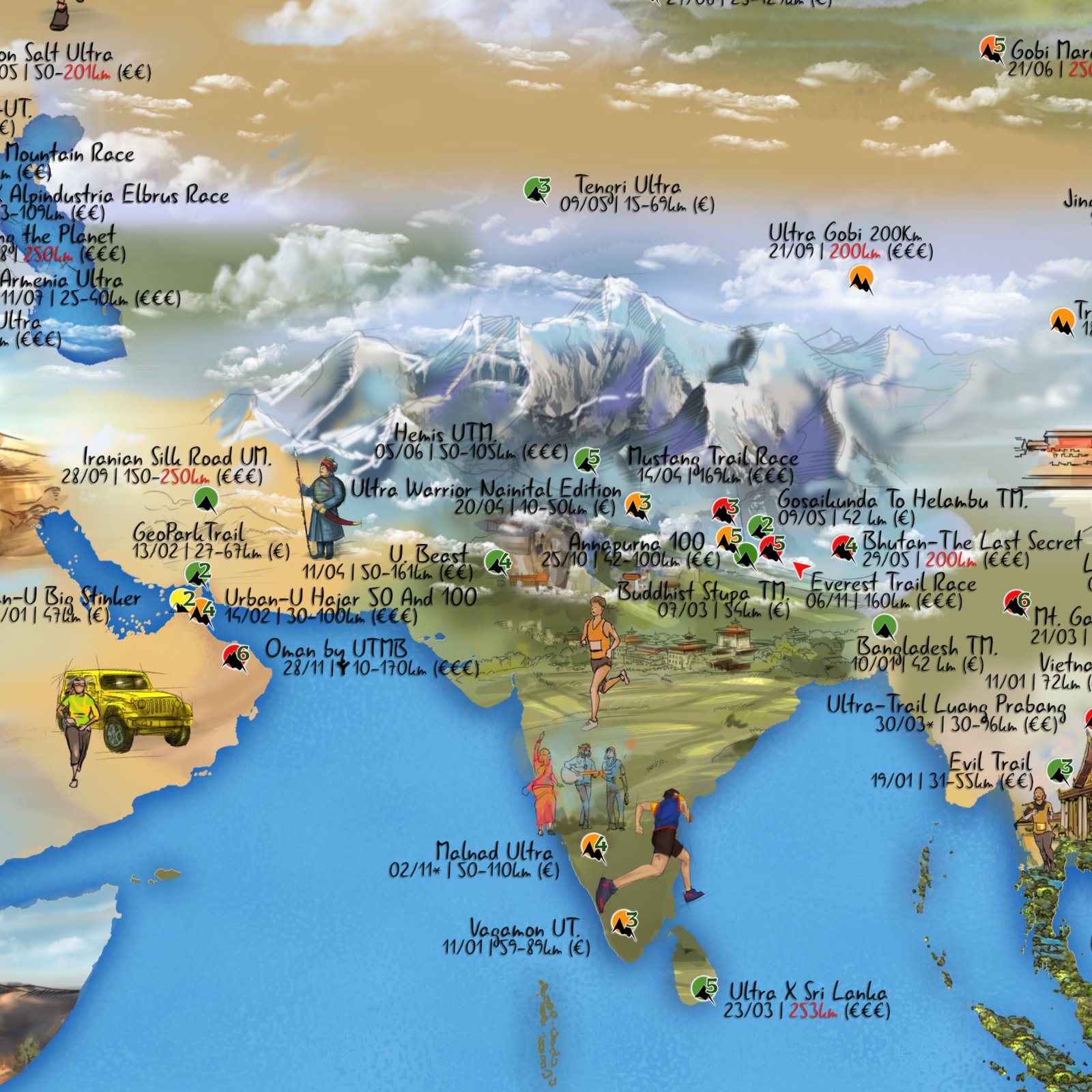 Several weeks of work had been necessary to illustrate the Running Trail 301 map. This paper artwork provides an insight of what you can expect from your next races in most remote corners of our beautiful planet!