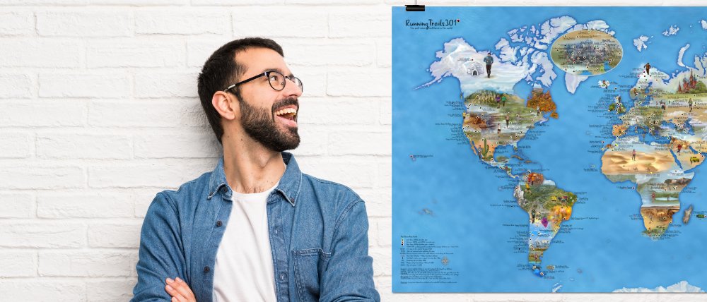Good mix of map making and design, Mapospheres created a world map for adventurous runners. It geo-localizes 301 Trail Races and provides information about elevation gain, UTMB points, entry fees and more. You can pin your favorite races that you have done or plan the next ones with a marker on our writable foil. The map comes on big format, printed on demand and easy to order for newbies or seasoned runners!