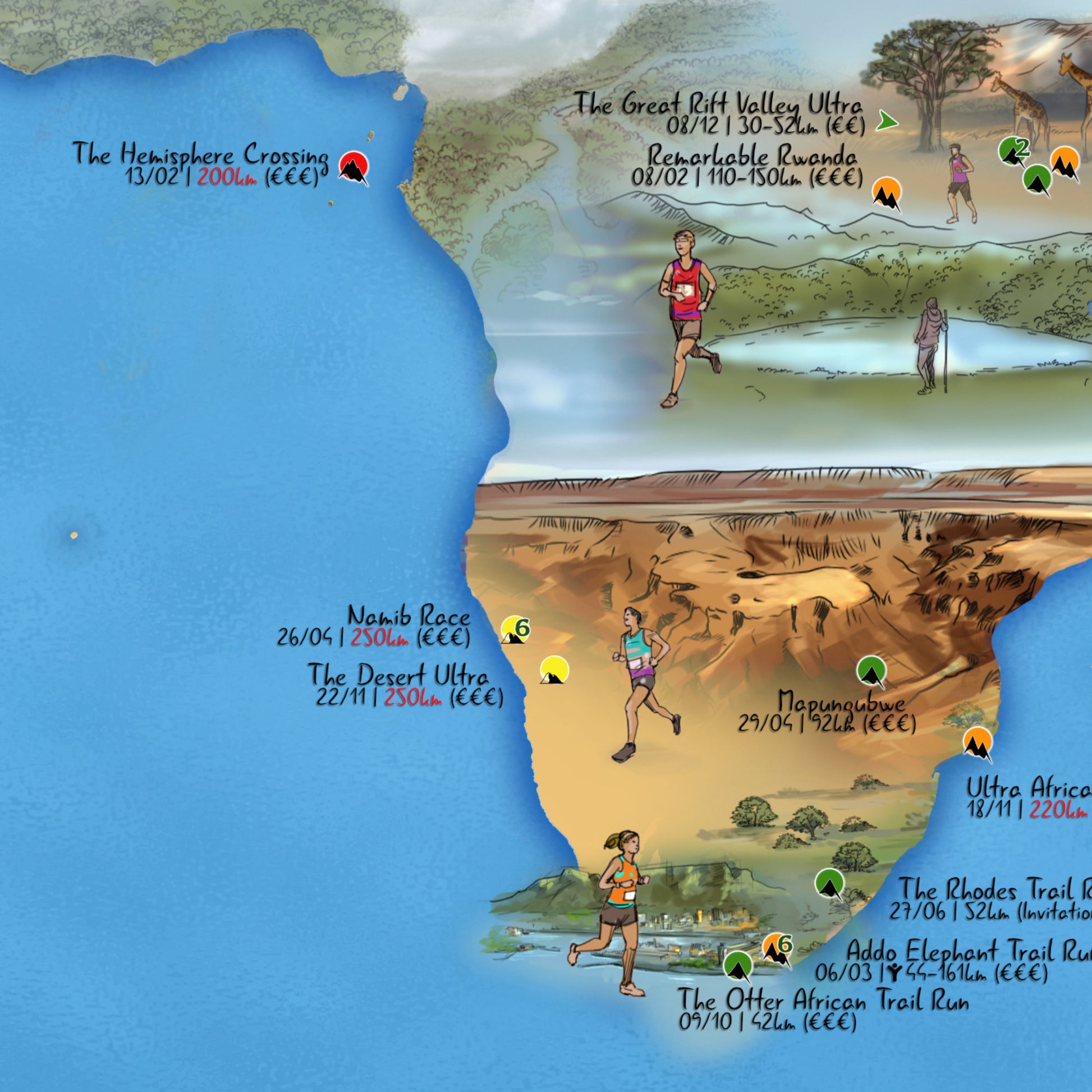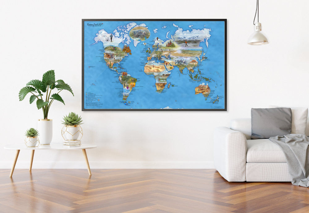 Mapospheres ha creado un mapa del mundo para corredores aventureros, una buena combinación de diseño y creación de mapas. Geolocaliza 301 carreras de trail y proporciona información sobre desniveles, puntos UTMB, tarifas de inscripción y mucho más. Puedes marcar tus carreras favoritas o planificar las próximas con un marcador en nuestra lámina para escribir. El mapa viene en formato grande, se imprime a pedido y es fácil de pedir para principiantes o corredores experimentados.