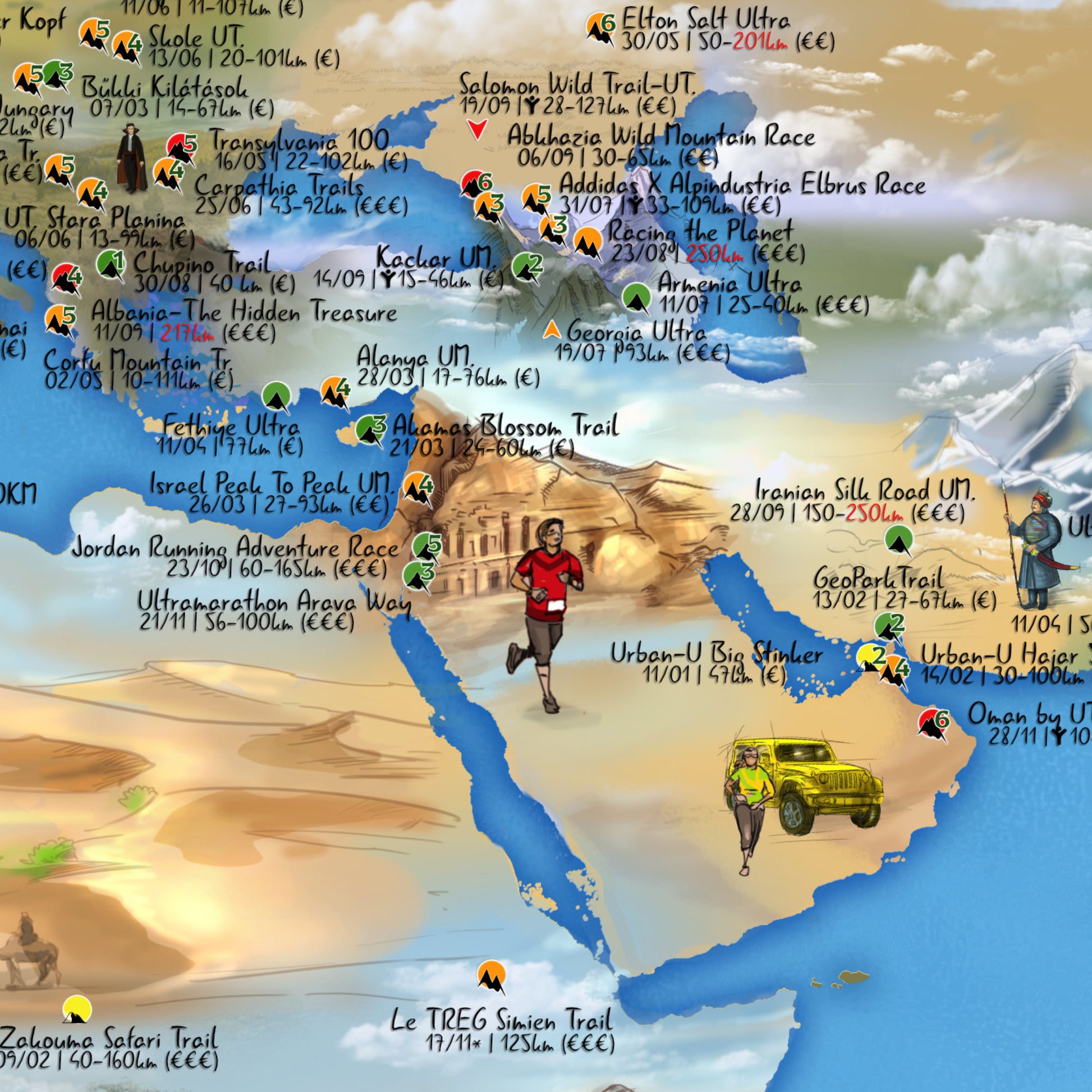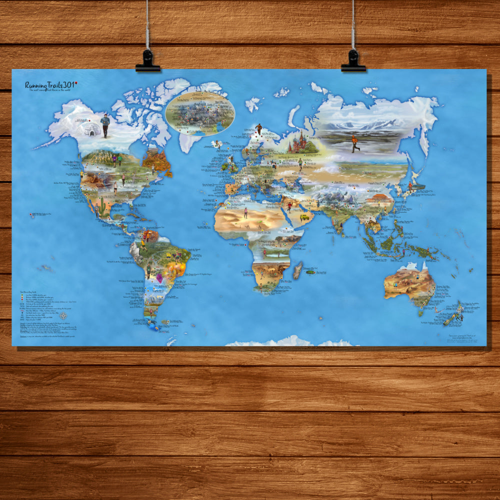 Se necesitaron varias semanas de trabajo para ilustrar el mapa de Running Trail 301. ¡Esta obra de arte en papel te da una idea de lo que puedes esperar de tus próximas carreras en los rincones más remotos de nuestro hermoso planeta!